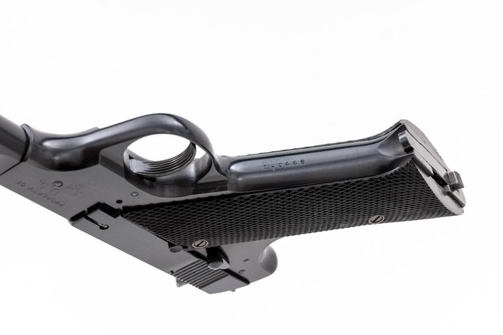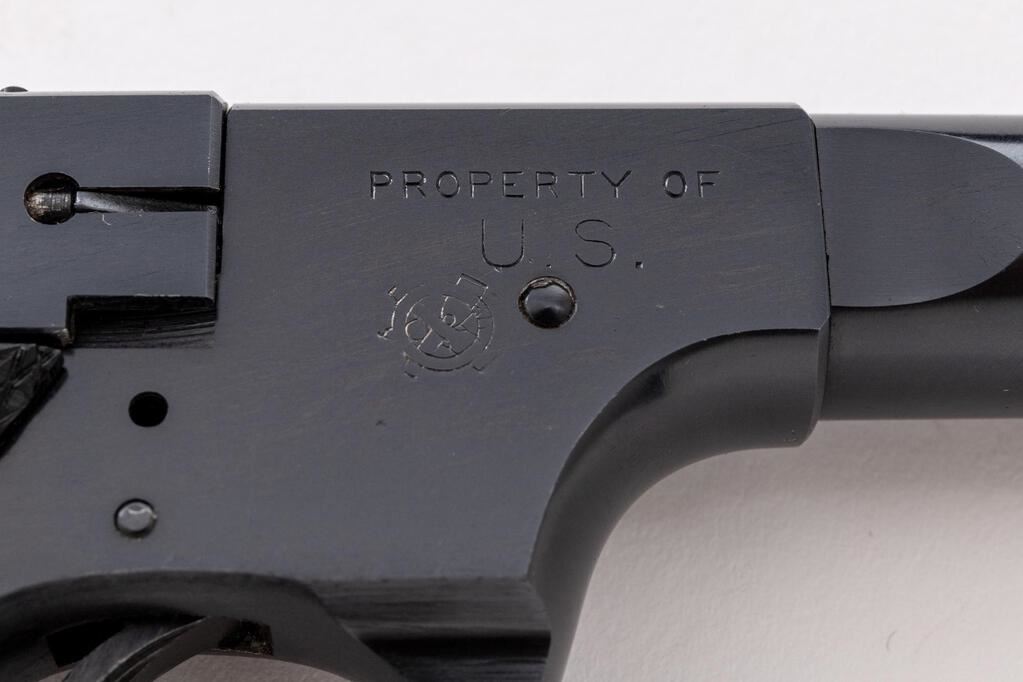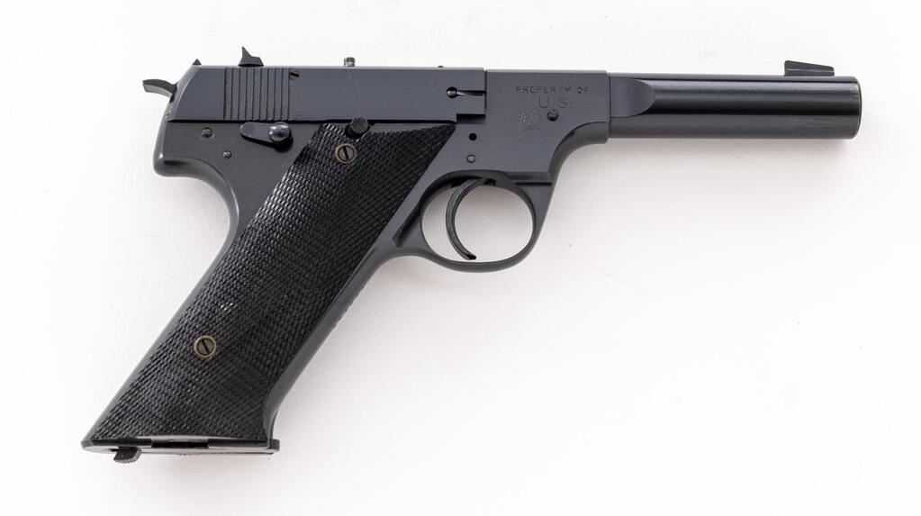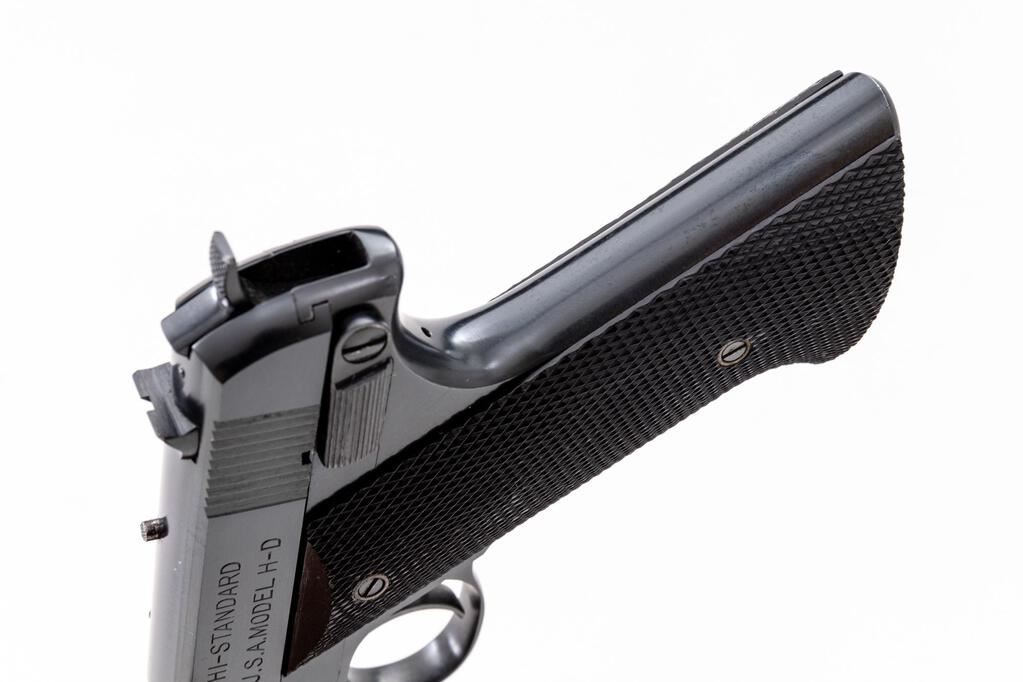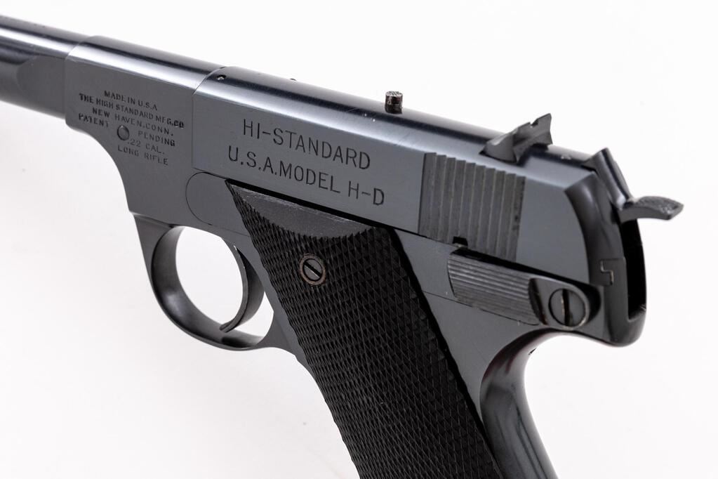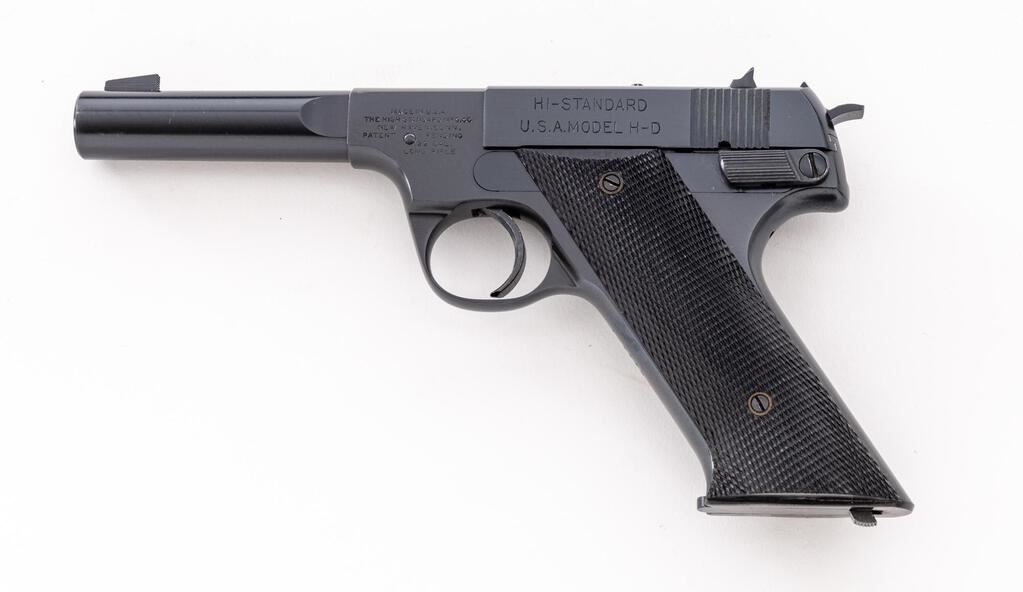 Hi-Standard U.S.A. Model H-D Semi-Automatic Pistol, #119448, .22 L.R. cal., 4.5" medium-weight barrel, serrated blade front and square-notched drift adjustable rear sights, external hammer, high-gloss blue finish, external safety, black two-piece checkered hard rubber grips, external safety and ribbed trigger, with an unmarked two-tone 10-rd. magazine. Mfg'd 1944. Pistol is in fine+ overall condition retaining approx. 93%-95% factory high-gloss blue finish, with light scratches on the barrel and wear at the muzzle. Top of barrel is marked "PROPERTY OF U.S.A."; left side of slide is marked "HI-STANDARD/U.S.A. MODEL H-D"; right barrel lug is marked "PROPERTY OF U.S." with the crossed cannons symbol. Grips are very good with small chips at the bases of both panels near the magazine well. Action is crisp, bore is very good with clearly defined rifling. The USA Model HD was developed in response to the government's need for a training pistol similar to the Colt Model 1911. Mfg'd from only 1943-1945. Est.: $600-$800. (C&R/PPT)