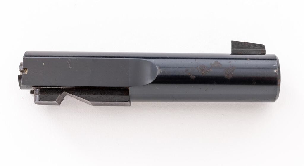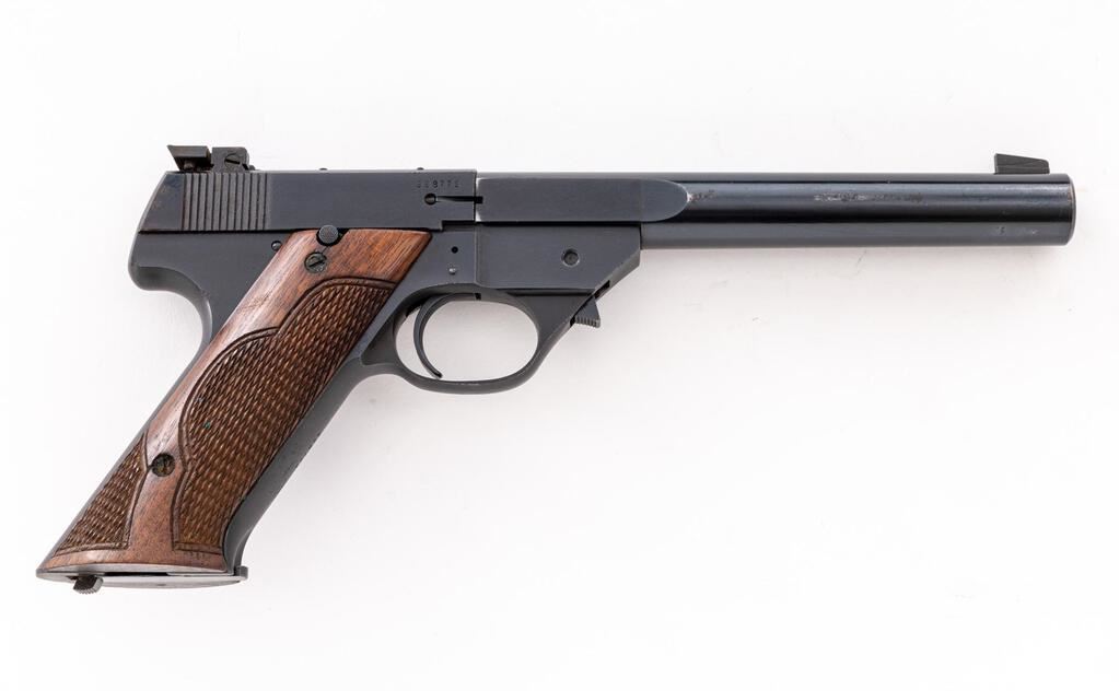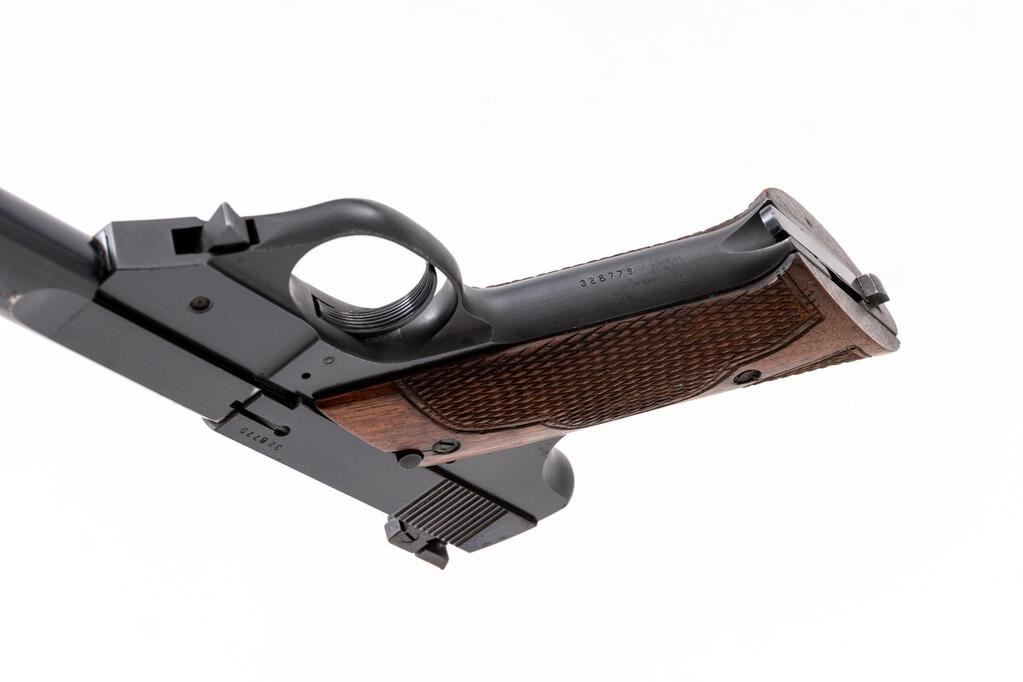 Hi-Standard Model GE Semi-Automatic Pistol, #328779, .22 L.R. cal., 6.75" heavy bull barrel, blade front and adjustable "Davis" rear sights, lever takedown, blue finish, deluxe checkered walnut hand checkered two-piece grips, and one unmarked two-tone 10-rd. magazine. Includes an additional 4.5" bull barrel with the matching serial number etched on the lug. Left barrel lug is marked "HIGH STANDARD MFG. CORP./NEW HAVEN, CONN. U.S.A." Mfg'd 1950. Pistol is in fine overall condition retaining approx. 92% toning blue finish with thinning at the muzzle, along the barrel and the grip straps. There are small areas of light surface rust along the barrel and some surface rust and light roughness at the muzzle. Grips are in very good condition. Action is crisp, bore is very good with defined rifling. (4.5" barrel is very good; however, there is light surface rust on the right side due to poor storage.) The Model GE was a deluxe high-end offering that was only mfg'd for two years, 1949-1950, with a limited production of approx. 2,900 units. Est.: $800-$1,200. (C&R/PPT)