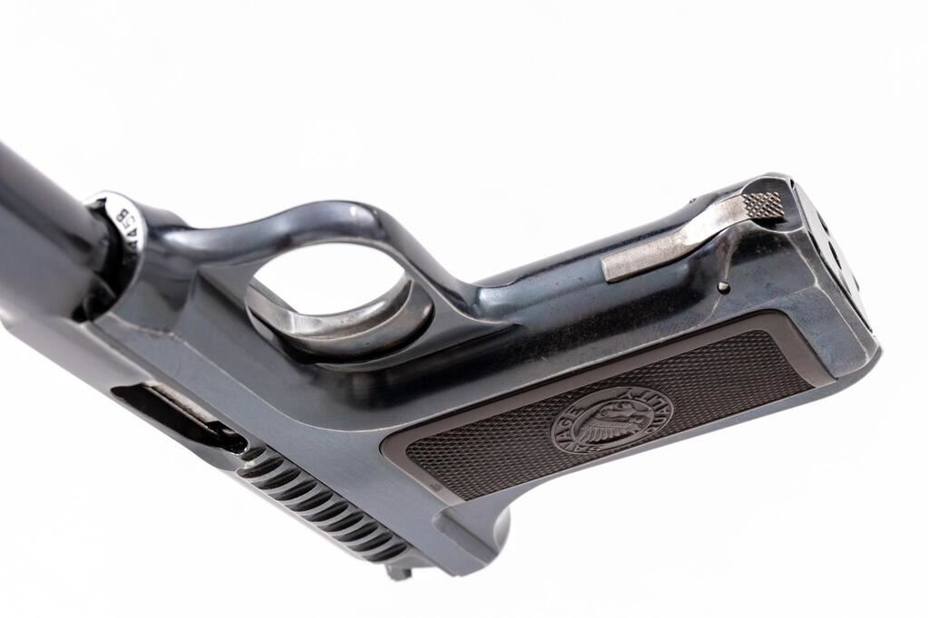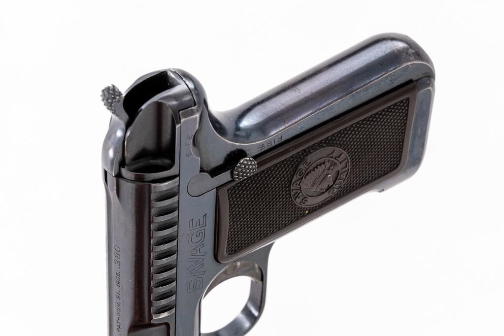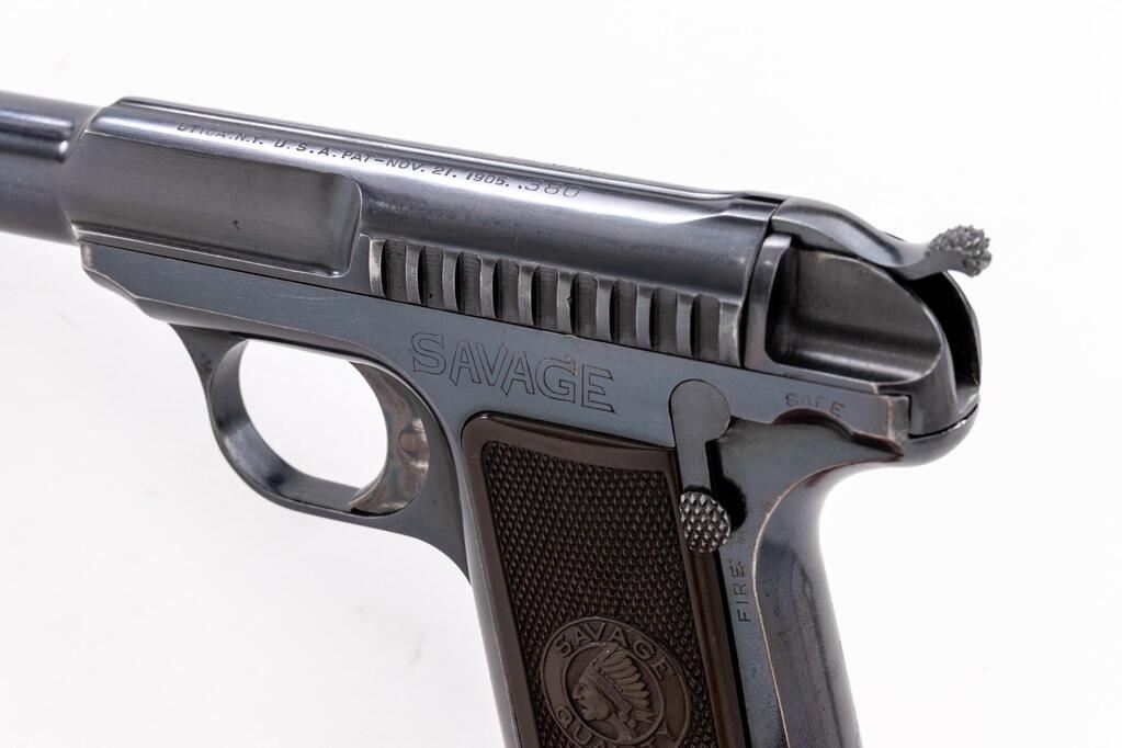 Savage Model 1907 Semi-Automatic Pistol, #6445B, .380 ACP cal., 4.3" barrel, blade front and fixed rear sights, exposed cocking piece, blue finish, checkered two-piece hard rubber Savage Quality marked grips, and one 9-rd. unmarked magazine. Left rear of the frame is marked "SAVAGE". Mfg'd 1914. Pistol is in fine overall condition retaining approx. 92%-94% thinning factory blue finish, with losses on both sides of the muzzle and edgewear on both the slide and frame. Both the front and rear grip straps show thinning finish with wear along the sharp edges. Trigger shows muted case color. Grips are in very good condition showing "SAVAGE QUALITY" logos with a crisp brave figure. Action is crisp, bore is very good with clearly defined rifling. Est.: $600-$800. (C&R/PPT)