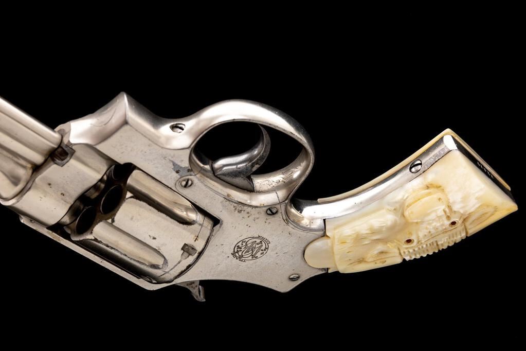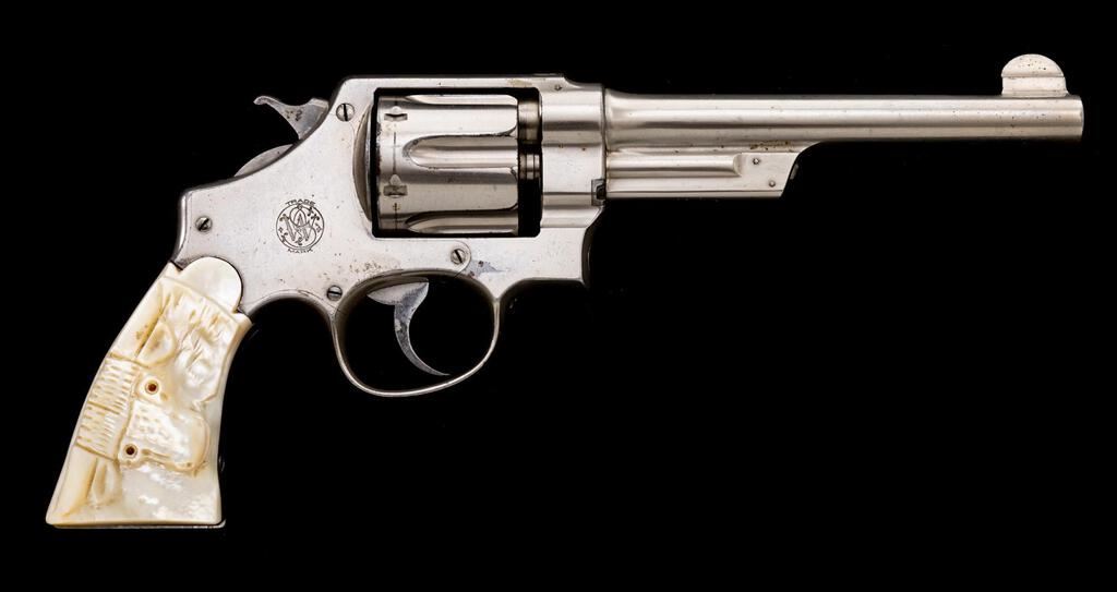 Smith & Wesson .44 Hand Ejector First Model (Triple-Lock) Double Action Revolver, #13917, .44 S&W Spec. cal., 6.5" pinned barrel, factory nickel finish, pearl grips; right grip with a carved steers head with small ruby eyes. Roman numerals XXVII are scratched into back of the right grip. This revolver also features a round blade front and standard notched rear sight, color case hardened hammer and smooth trigger. Frame and yoke with matching assembly numbers (6444). Barrel, cylinder, yoke lock and extractor are numbered to the gun. L.?. Doyle is scratched into the lower left edge of the grip frame, under the grip. "Q-1/ 904357/JB" is lightly scratched into the lower front edge on the right side of the frame. Shipped to Stauffer Eshleman & Co., New Orleans, LA., Dec. 6, 1917, with factory letter signed by S&W Historian Roy G. Jinks. Letter verifies barrel length, finish, and the original grips are listed as checkered walnut. Condition is very good retaining approx. 93% factory nickel finish, with general light handling marks and a little fine scratching. There is a small amount of intermittent pinprick pitting present on the metal, most frequent on the sideplate. There are also spots of light pitting on the sides of the grip frame, under the grips. Factory lettering is clear. Case colors have mostly silvered out with some mild pitting and darkening to sides of the trigger. Grips fit well and are just a little proud at the butt and lower portion of the backstrap. Both have a nice, aged appearance, carving with well-defined edges, neither have any major blemishes. Action cycles smoothly and locks up securely. Bore is clean, lands and grooves are clearly defined, no frosting or erosion. An interesting piece with its added markings that are worth further research. Est.: $1,400-$1,800. (C&R/PPT)