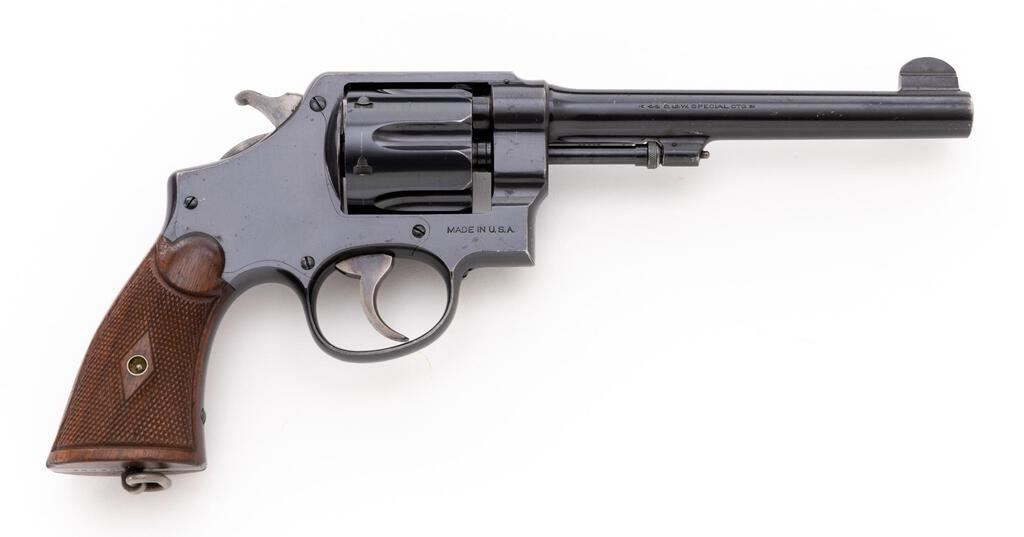 Smith & Wesson .44 Hand Ejector Second Model Double Action Revolver, #20828, .44 S&W Spec. cal., 6.5" barrel, blue finish, checkered diamond center walnut grips, lanyard ring, round blade front sight, standard notched rear sight, smooth color case hardened trigger, and checkered hammer. Frame and yoke with matching assembly numbers (84510). Barrel, cylinder, and extractor are numbered to the gun. One of the Second Model .44 Hand Ejectors that was built on a 1917 frame with "(eagle's head)" inspection mark on the inside, near the assembly number. Shipped to S.C. Melzer & Co., August 14, 1923; with factory letter signed by S&W Historian Roy G. Jinks. Letter does not specify any of the revolver's features. In unnumbered one-piece maroon "Patent/Display" box. Condition is very good retaining approx. 92%-94% factory blue. Metal with tiny nicks and scratches from handling and use. There is mild pitting visible on the left side of the frame, as well as some small specks to the right side. Factory lettering is clear. Approx. 55%-60% muted case colors remain. Grip checkering is primarily sharp, smooth borders show a small amount of typical light handling marks, no major blemishes. Action cycles smoothly and locks up securely. Bore is very good, bright, rifling is clearly defined. Box shows edgewear and a gouge to top of the lid, end label is clear. Est.: $1,500-$1,800. (C&R/PPT)