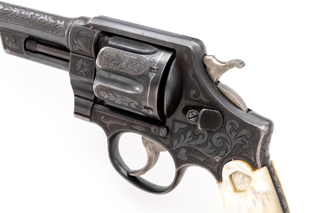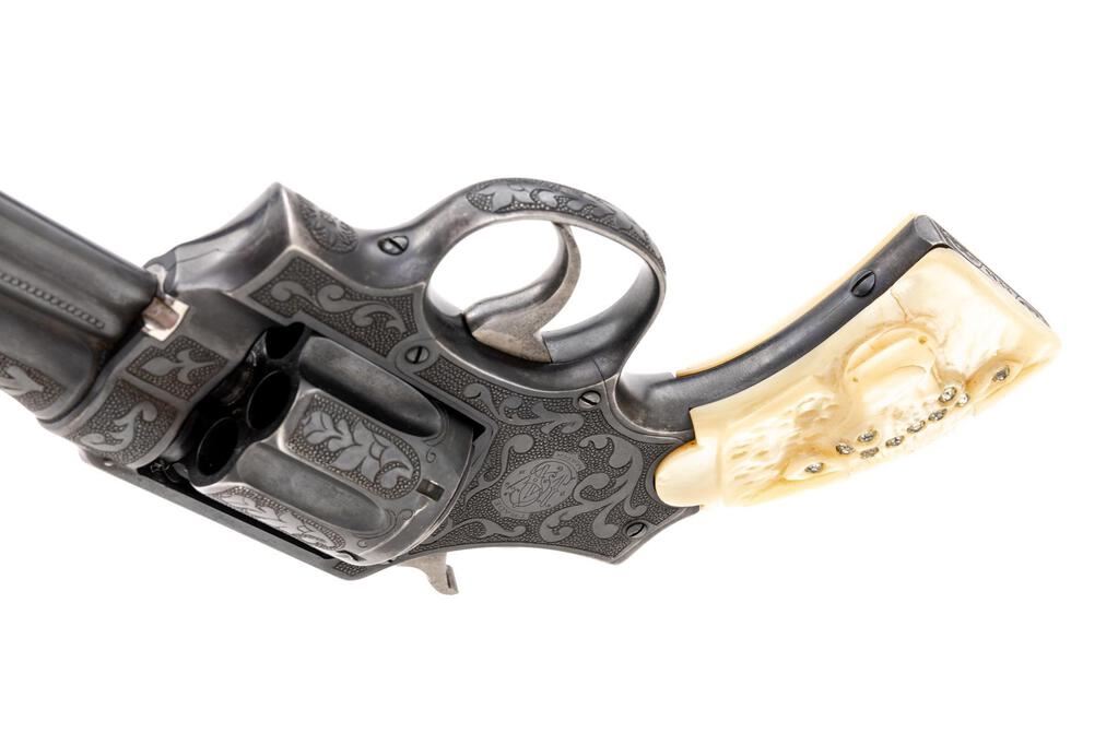 Engraved Smith & Wesson .44 Hand Ejector First Model (Triple-Lock) Double Action Revolver, #2268, .44 S&W Spec. cal., 7.5" pinned barrel, blue finish, pearl grips; right grip with a carved steers head that is adorned with several small clear gemstones at the eyes, ears, and across the forehead. This revolver also features a round blade front and standard notched rear sights, color case hardened hammer and smooth trigger. Nicely accomplished non-factory engraving covers approx. 70% of the metal surfaces. Engraving includes scroll and floral motifs set against a punch-dot background. Work is not signed. Frame and yoke with matching assembly numbers (4011). Barrel, cylinder, yoke lock and extractor are numbered to the gun. Shipped to Schoverling Dale & Gale Co., New York City, NY, Nov. 18, 1908, with factory letter signed by S&W Historian Roy G. Jinks. Letter verifies barrel length, finish, and the original grips are listed as checkered walnut. Condition is very good overall retaining approx. 90% low luster finish. Wear at the muzzle, lower portion of the frame/trigger guard, and front strap accounts for much of the finish loss. Factory lettering is clear, and engraving is crisp. There are intermittent tiny pin prick blemishes present on parts of the metal, as well as a few small mars to the left side of the front sight blade. Only trace amounts of case coloring remain, and there is very mild pitting visible on the sides of the trigger. Both grips show moderate yellowing and have a nice, aged appearance. Left grip fits just a little small with a small chip at the heel, and a vacant spot at the upper edge that likely held some sort of decorative medallion. Right grip fits better, carving is defined, with a tiny chip at the toe and a little larger chip missing from the heel, as well as a small age crack in between the steer's mouth and grip edge. Action cycles smoothly and locks up securely. Bore shows moderate wear, is clean, lands and grooves are clearly defined, but there are a few small spots of erosion approx. 2" down from the muzzle. Est.: $2,000-$3,000. (C&R/PPT)