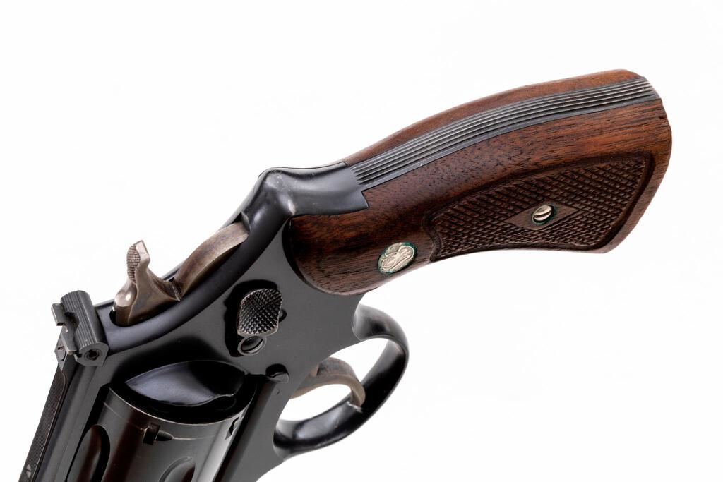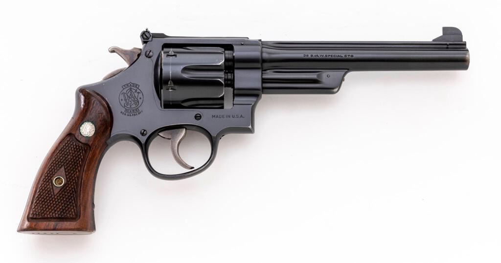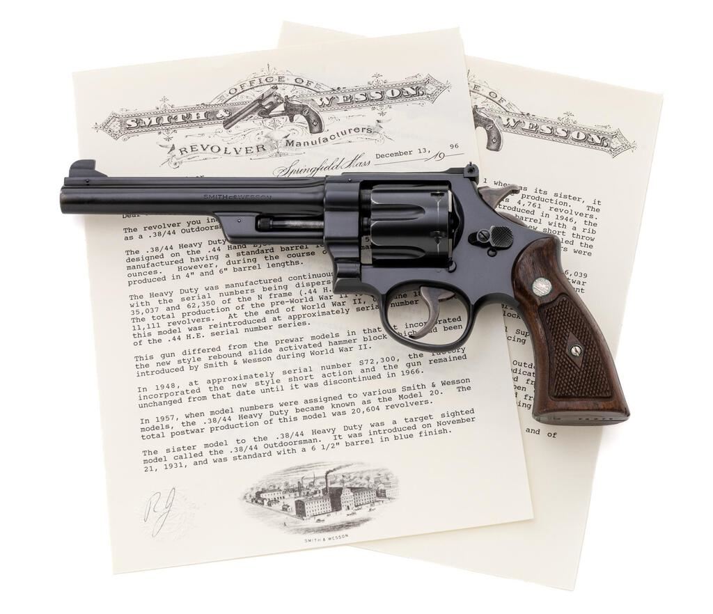 Post-War Transitional Smith & Wesson .38/44 Outdoorsman Double Action Revolver, #S70079, .38 S&W Spec. cal., 6.5" pinned barrel, blue finish, checkered diamond center walnut Magna grips, Patridge front and square-notched fully adjustable rear sight, with color case hardened checkered hammer and serrated trigger. Either the frame or yoke was likely mis-stamped as the assembly numbers are marked as 10556 and 10566. Barrel, cylinder, extractor, and back of right grip are numbered to the gun. Interesting that the factory letter states that this gun was shipped in 1946 to "Nobody", as it is open on the records. It mentions that this could be due to an oversight by the shipping clerk or that the gun was stolen. The letter does not list any of the revolver's features. In a two-piece maroon Outdoorsman Target box that is numbered in pencil to another gun (S69697). Condition is about fine retaining approx. 92%-94% factory blue. Muzzle wear, cylinder index line, and a little finish wear to the back of the frame accounts for much of the finish loss. Factory lettering is clear. Approx. 80% case colors remain. Grips with scattered shallow handling marks, checkering is primarily crisp. There is a very small chip missing from the lower back edge of the left grip. Action is crisp and cycles smoothly, cylinder locks up securely. Bore appears near excellent, bright with well-defined rifling. Box shows moderate age and wear. The corners are intact, end label is clear. Est.: $1,500-$1,800. (C&R/PPT)