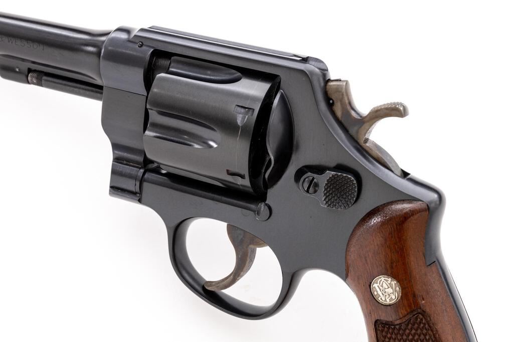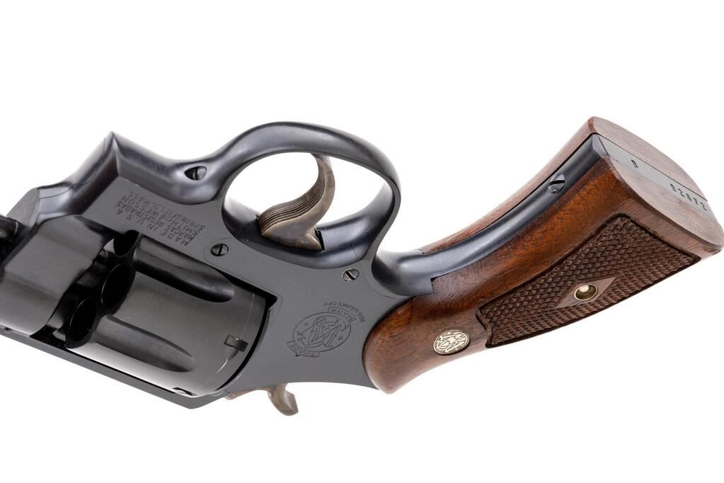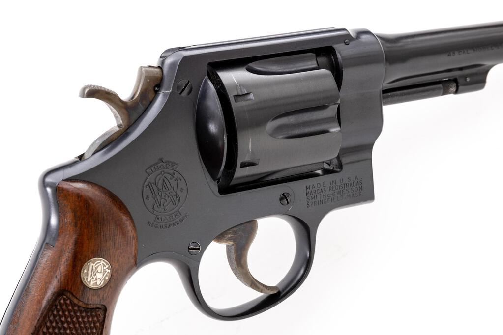 Smith & Wesson .45 Hand Ejector Model of 1950 Army (Pre-Model 22) Double Action Revolver, #S92872, .45 ACP cal., 5.5" barrel, blue finish, checkered diamond center walnut Magna grips with S&W medallions, round blade front sight, standard notched rear sight, with color case hardened hammer and trigger. Mfg'd ca. 1952-1953. Frame and yoke with matching assembly numbers (8597). Barrel, cylinder, extractor, and right grip are numbered to the gun. Right side of the barrel is marked "45 CAL. MODEL 1950". Condition is excellent retaining approx. 97-98% blue. Light muzzle wear and cylinder index line accounts for the finish loss. Otherwise, showing only a small amount of light handling marks. Case colors are strong, nearly all remain. The "N" in Smith & Wesson on the left side of the barrel is a little light, other factory lettering is clear. There is an impression to the bottom edge of the right grip, otherwise both show little handling wear; checkering detail is crisp. Action cycles smoothly and locks up securely. Bore is bright with well-defined rifling. Est.: $1,800-$2,400. (C&R/PPT)