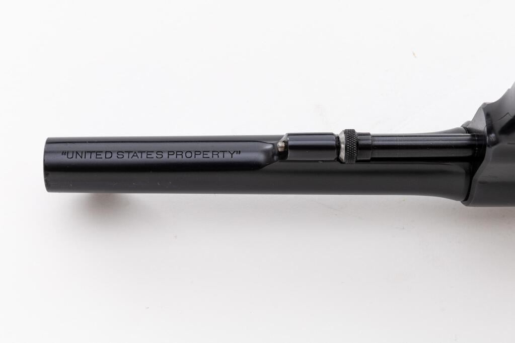 Excellent Early U.S. Military Smith & Wesson Model of 1917 Double Action Revolver, #2843, .45 ACP/.45 Auto Rim cal., 5-1/2" pinned barrel, blue finish, two-piece smooth walnut grips, round blade front sight and standard square-notched rear sight, lanyard ring, with color case hardened trigger and concentric grooved hammer. Frame and yoke with matching assembly numbers (2050). Barrel, cylinder, and extractor are numbered to the gun. Bottom of the barrel is stamped "UNITED STATES PROPERTY". There is an "S" stamped on the bottom of the barrel and back of cylinder. "GHS" inspectors mark on left side of the frame, in front of the hammer. Shipped to U.S. Armory, Nov. 17, 1917; with factory letter signed by S&W Historian Roy G. Jinks. Letter does not mention the revolvers configuration. Condition is excellent retaining approx. 97%-98% factory blue. There are a few light scratches and mild wear at the muzzle. Additional there is a small spot of finish wear to the butt of the gun, caused by the lanyard ring. Case colors are vibrant, and a majority remain. There are a few tiny specks of pitting visible on the back strap. Factory lettering is crisp. Grips are very good with intermittent shallow indentations and other small handling marks. Action cycles smoothly and locks up securely. There is the very beginning stages of some very mild frosting visible in the bore, rifling is clearly defined. Est.: $1,800-$2,400. (C&R/PPT)