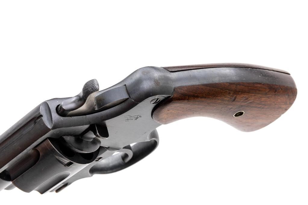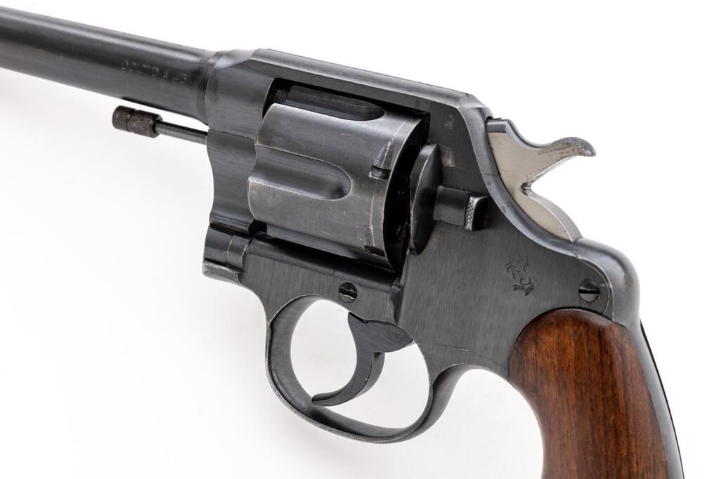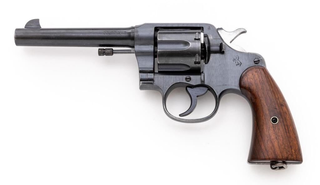 U.S. Army Colt Model 1917 Double Action Revolver, #121568, .45 ACP cal., 5-1/2" barrel, blue finish, smooth walnut grips, blade front sight, standard notched rear sight, with lanyard ring. Mfg'd 1918. Butt of the gun has standard U.S. Army markings and serial number. Left side of frame, in front of the trigger is marked "(eagle head)/S20". Bottom of the barrel is marked "UNITED STATES PROPERTY". Metal surfaces rate in fine condition and retain approx. 93%-94% factory blue. There are intermittent light scratches on the barrel and cylinder. Muzzle and edges of the trigger guard show light wear. Backstrap shows some thinning and mild patina. Factory lettering is crisp. Grips are very good, left grip with more frequent shallow surface dents and handling marks, right grip shows less handling wear. Both have a number written on the back (214915), that does not match any numbers on the revolver. Action cycles smoothly and locks up securely. Bore appears excellent and is bright with well-defined rifling. Est.: $1,200-$1,800. (C&R/PPT)