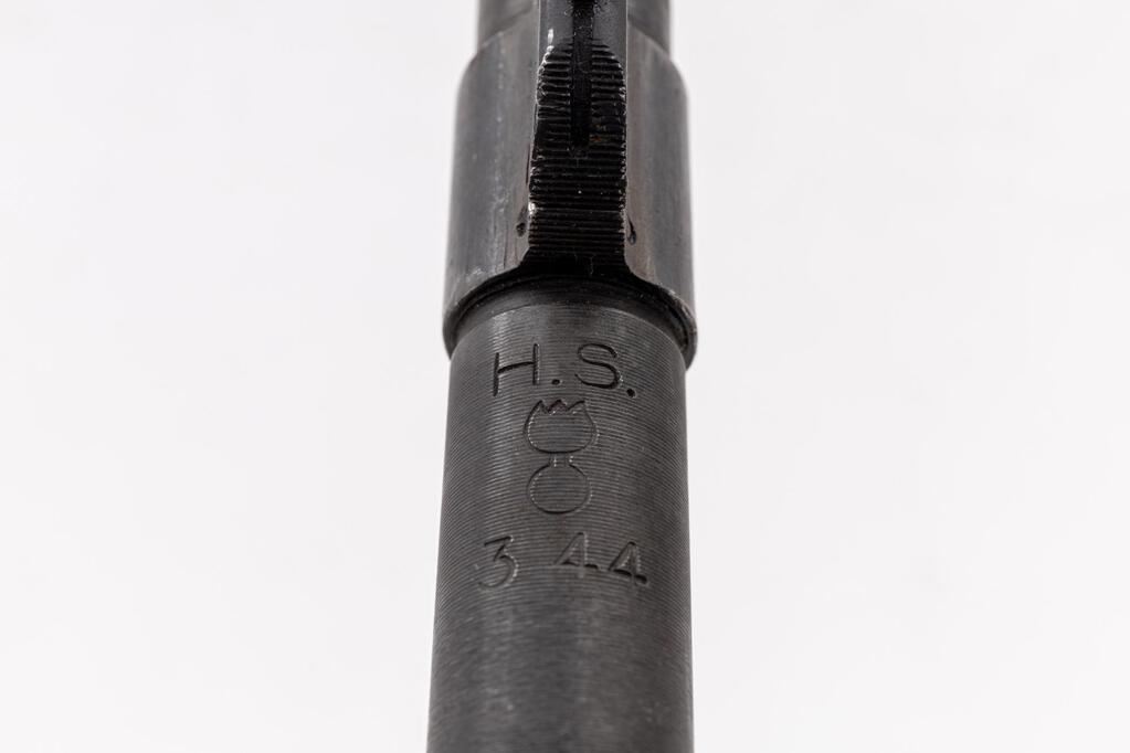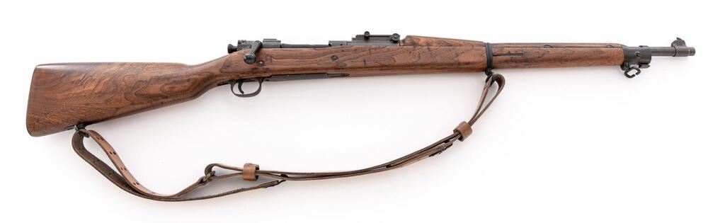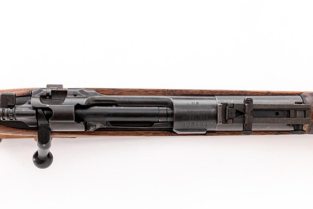 Springfield Model 1903 Bolt Action Rifle, #803484, .30-06 cal., 24" barrel, parkerized finish, walnut stock set, blade front sight and adjustable folding leaf rear sight. A very good condition nickel oiler is in the butt trap and an excellent condition U.S.G.I. leather sling is attached to the swivels. Marked on top of receiver ring "U.S. SPRINGFIELD ARMORY MODEL 1903". Barrel behind the front sight is marked "H.S.(Flaming Bomb)3 44". The scant stock has an "S" stamped into the tip of the forend. Condition overall is very good as rebuilt for service in WWII, with the metal retaining approx. 90% finish, with polishing to the receiver and bolt knob. Stock set has been sanded smooth and oiled over old handling marks, now very good. Action operates smoothly, bright bore is excellent with well-defined rifling. Est.: $800-$1,100. (C&R)