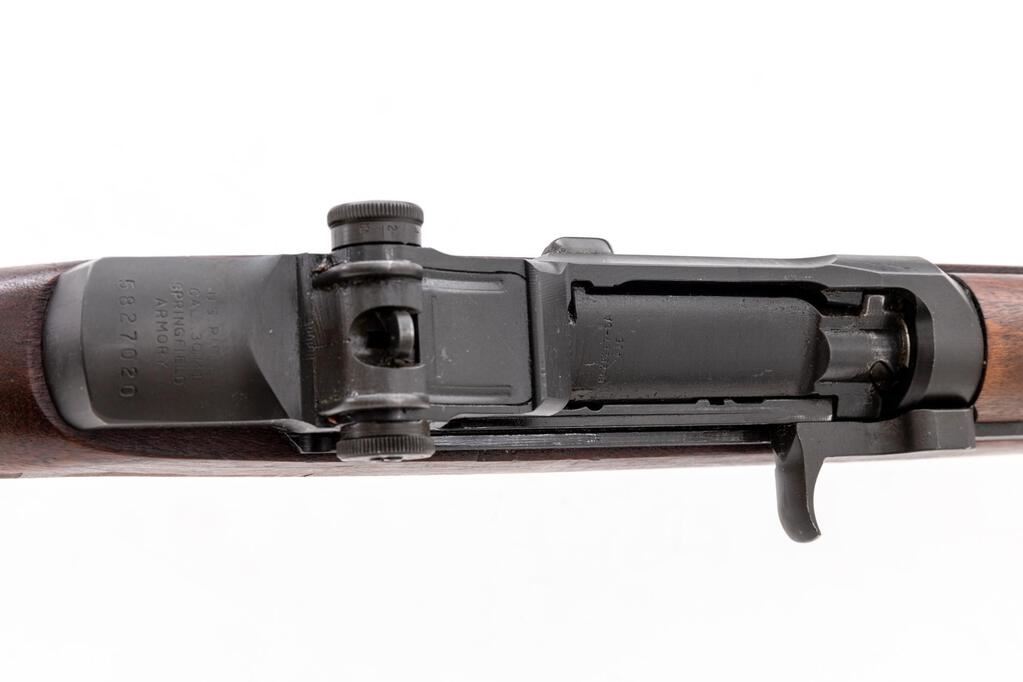 Springfield M1 Garand Semi-Automatic Rifle, #5827020, .30-06 cal., 24" barrel, parkerized finish, walnut stock set, blade front sight with protectors and adjustable aperture rear sight. Marked on receiver tang "U.S.RIFLE CAL..30 M1 SPRINGFIELD ARMORY"; on right-side barrel "SA" and "3 55". There is a U.S. Defense Dept. eagle cartouche on the left side of the stock forend and a "(circle)/P" firing proof on the underside of the wrist. Includes a very good condition CMP invoice, owner's manual, and "M1 Garand Correct Grade" Certificate of Authenticity, along with 9 en bloc clips. The bolt, trigger housing, hammer, and operating rod are all marked "SA". Condition overall is very good with the metal retaining over 90% finish, showing light wear to the left bolt lug and patina to the buttplate. Wood is very good showing handling marks and impressions to the even colored finish. Action operates smoothly, bright bore is excellent with sharp well-defined rifling. No visible import marks. Est.: $1,000-$1,200. (C&R)