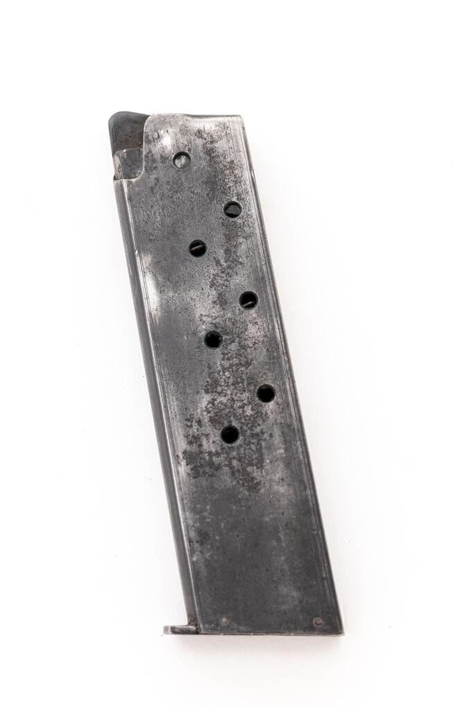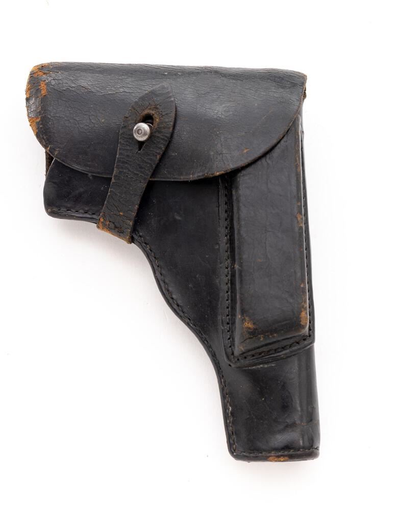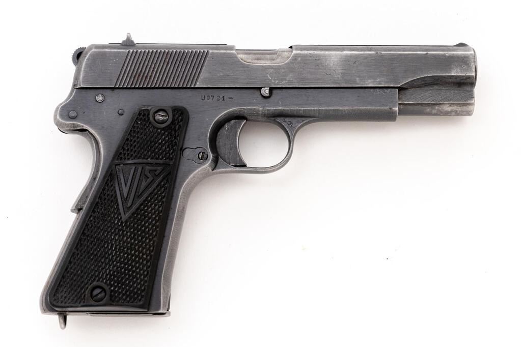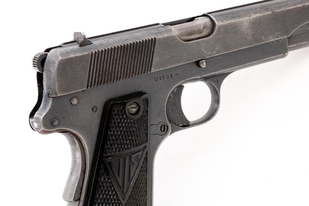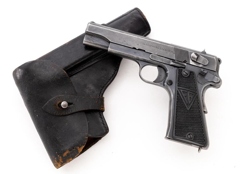 German Marked Polish Radom VIS Mod.35 (P-35(p)) Semi-Automatic Pistol, with Holster, #U0721, 9mm, 4-5/8" barrel, blued finish, integral fixed thin blade front sight and drift adjustable fixed rear sight with "V" groove, slide marked "FB Radom Vis Mod 35 Pat Nr.15567", Nazi eagle firing proof, "(eagle)823" waffenampt, "(eagle)77" on left side of frame, faint eagle waffenampt on right side of frame, hammer drop lever, grip safety, lanyard loop; checkered black hard rubber grips with FB & VIS logo, and two (2) blued steel magazines. Includes a black leather German military type holster with no visible markings. Rough war-time machining to frame and slide. Condition is good retaining approx. 70% thinning war-time blued finish, with wear on the slide and frame high edges, wear spots on sides of slide, tops of sights, tips of the hammer drop and hold open levers, rear of frame, trigger guard edges and bottom; front grip strap is thinning to gray, grip safety is thinning with freckled stains, mainspring housing is thinning to gray. Action, hold open, grip safety, and hammer drop all function properly; bore is bright and shiny with strong lands and grooves. Grips show light age and minor scratches. Magazine in the gun shows wear and lines from use, some freckling on the sides, and an "(eagle)189" stamp on the toe. Extra magazine shows heavy wear, thinning, freckling, and no markings. Holster shows age, cracking to the leather, mainly on the top flap and the retaining strap; the internal pull strap is intact. There is a faint ink stamp on the inside of the top flap. Body of the holster shows scuffs, scratches, minor age cracking, a re-sewn front belt strap, and the rear belt strap has been repaired with a loop of string. Est.: $1,000-$1,500. (C&R/PPT)