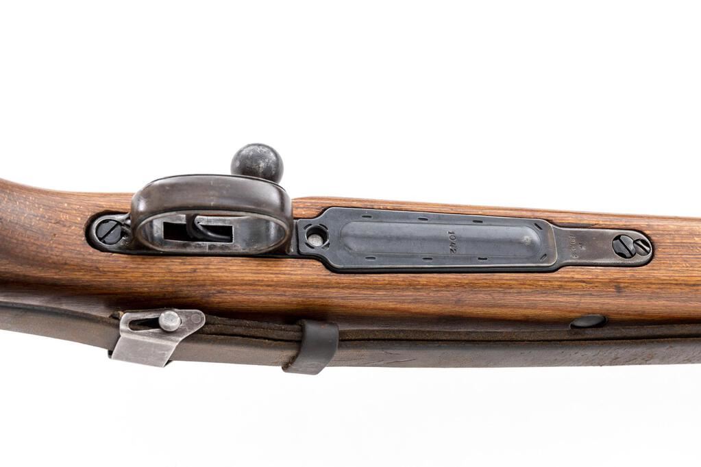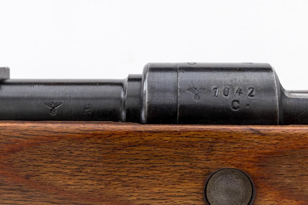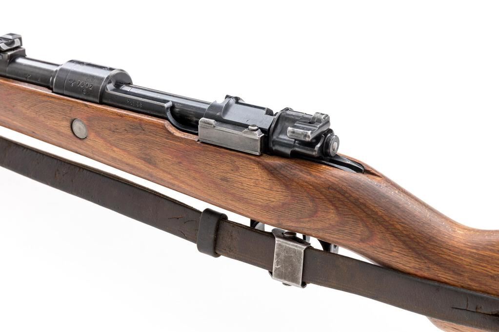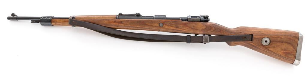 WWII German K98k dou-44 Bolt Action Rifle, #1042c, 7.92mm x 57mm, 23.6" barrel, blued finish, all visible numbers matching and correct, receiver marked "dou 44" for Waffenwerke Brunn, Bystrica, "(eagle)WaA480", "(eagle)480", and "(eagle)214" waffenampts, drift adjustable inverted "V" front sight, missing the sight hood, tangent rear sight adjustable from 1 to 20; stamped steel trigger guard and floorplate, stamped and welded barrel bands, bayonet lug, missing the cleaning rod; unmarked laminated wood stock and upper hand guard, side sling slot, bolt takedown disc, cupped buttplate, and leather sling. Condition is very good, the action, barrel, and small parts retaining approx. 80%-85% original blued finish, with wear on the high edges from use on the muzzle, rear sight, receiver, bolt handle and small parts. Bolt shows wear lines from use, with a slightly plum color extractor. Trigger guard shows light wear and fading to the thin late-war bluing. Action and safety function properly; bore is bright with a very light frosting, that may improve with cleaning. Stock shows light sanding overall, with a few light scratches and minor depressions/dings. Barrel bands show high edgewear to the blued finish. Stock disc shows age graying and minor freckles. Buttplate has been cleaned lightly and has scattered freckling and stains. Leather sling shows age, wear, minor cuts, scratches, and cracking. Overall, a nice example. Est.: $1,200-$1,800. (C&R)