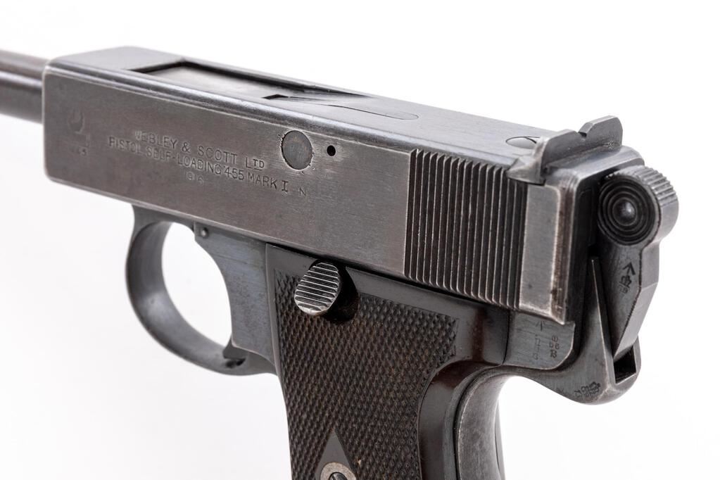 British Webley Mark 1(N) Royal Navy Issued Semi-Automatic Pistol, #7655, .455 Auto cal., 5" barrel, blued finish, checkered black plastic grip panels, blade front sight and drift adjustable rear sight with "U" notch. Lanyard ring is attached to the rear of the grip frame, and one 8-rd. magazine with 6 witness holes is included. Marked on left side slide with the Webley "Winged Bullet/W&S" logo in front of "Webley & SCOTT LTD/SELF-LOADING 455 MARK 1/N/1916", with "N" indicating Royal Navy issue. Rear of right side frame and top of slide stamped with "'17" in service date indicating that this pistol was accepted into the Royal Navy service in 1917, along with Birmingham proof and view stamps. Left side frame, top of magazine follower, and center of both grip panels are marked with a "Broad Arrow" property mark. Magazine spine is stamped with a Birmingham inspection mark. Matching numbers on underside of frame and left side of grip safety. Condition overall is very good with the barrel retaining approx. 90% finish, and the frame and slide with areas of fine patina and fading along both sides of the slide. Magazine shows overall wear to the finish with areas of patina. Grips have toned from age and show light flattening to the checkering. Action operates smoothly, bright bore is very good with defined rifling. No visible import arks. Est.: $1,200-$1,600. (C&R/PPT)