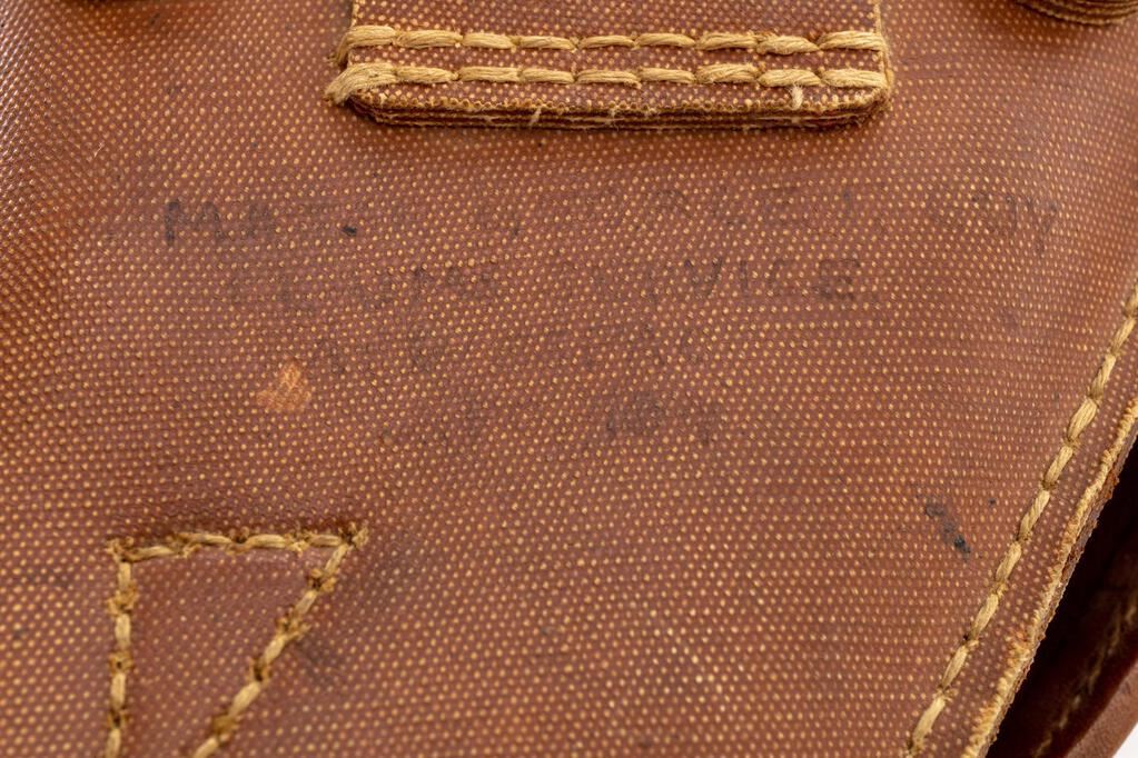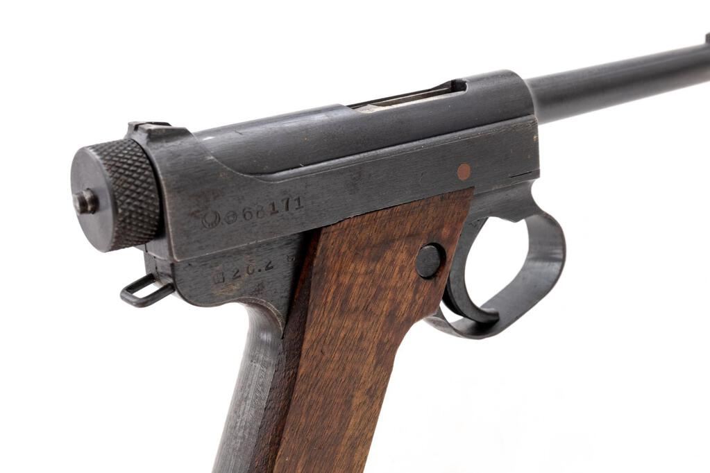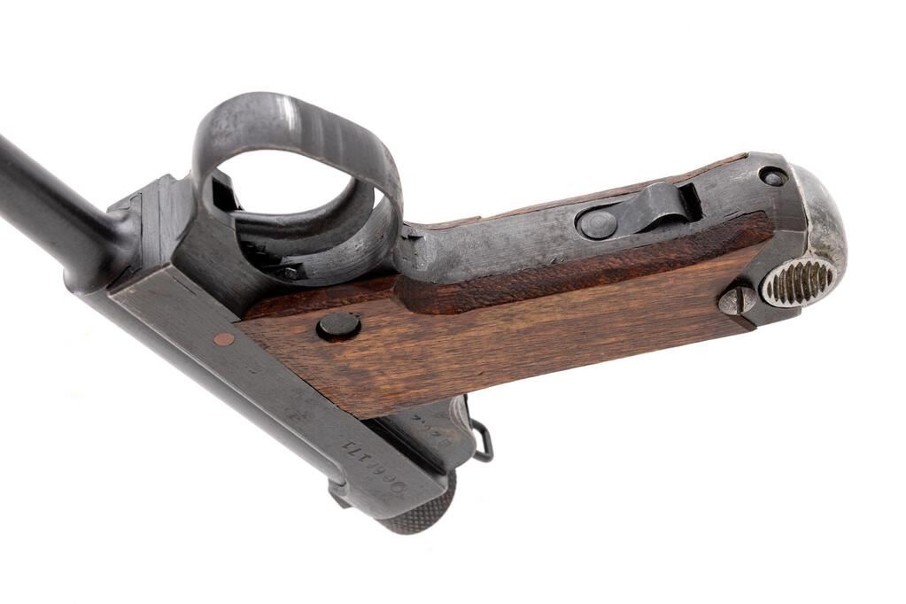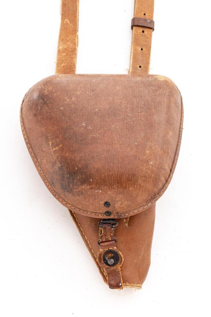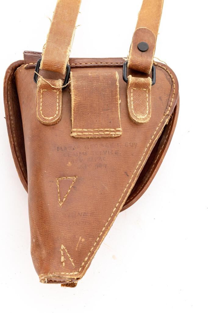 WWII Japanese Type 14 Nambu Semi-Automatic Pistol, with Holster & 2 Matching Magazines, #68171, 8mm Nambu cal., 4.75" barrel, blued finish, all visible numbers matching, Toriimatsu factory of Nagoya Arsenal proof marks, dated Showa 20.2 (February 1945), large trigger guard, drift adjustable inverted "V" front sight, integral fixed rear sight with square notch, coarse knurled cocking knob, and lanyard loop. Smooth mahogany wood grips are numbered to the gun, with two matching numbered blued steel magazines with pot metal bases. Includes a rubberized canvas hard shell holster with shoulder strap, extra firing pin, and cleaning rod. Condition is excellent, retaining approx. 90% original late-war blued finish, with slight holster wear at the muzzle sides and bottom front of barrel, high edges and rear of the slide, front edge of the trigger guard, top of slide from firing, typical half-moon scratch around the safety lever area on side of slide, front and rear grip straps are thinning slightly with a light freckling. Action, hold open, and safety all function properly; bore is bright and shiny. Grips are very nice showing only the slightest use; grip screws show some wear, with clean slots. Magazines show thinning and wear from use, with heavy freckling over most of the surfaces; mag bases show minor dings and wear from use, and light oxidation. Holster is in good condition with a few missing stitches on the leather hinge for the top clamshell cover, overall stiffness to the body and component parts, some separation to the laminations on the shoulder strap, a GI's name written on the back side (hard to make out exactly what it reads), extra firing pin inside, and blued cleaning rod. There is some soiling, scuffs, scratches, and wear to the outside of the holster, and minor cracking to the leather retaining tab. Overall, an excellent example in very nice condition. Est.: $800-$1,100. (C&R/PPT)