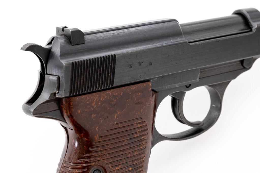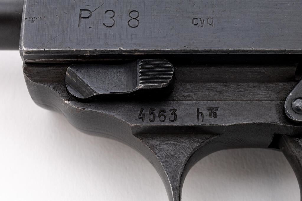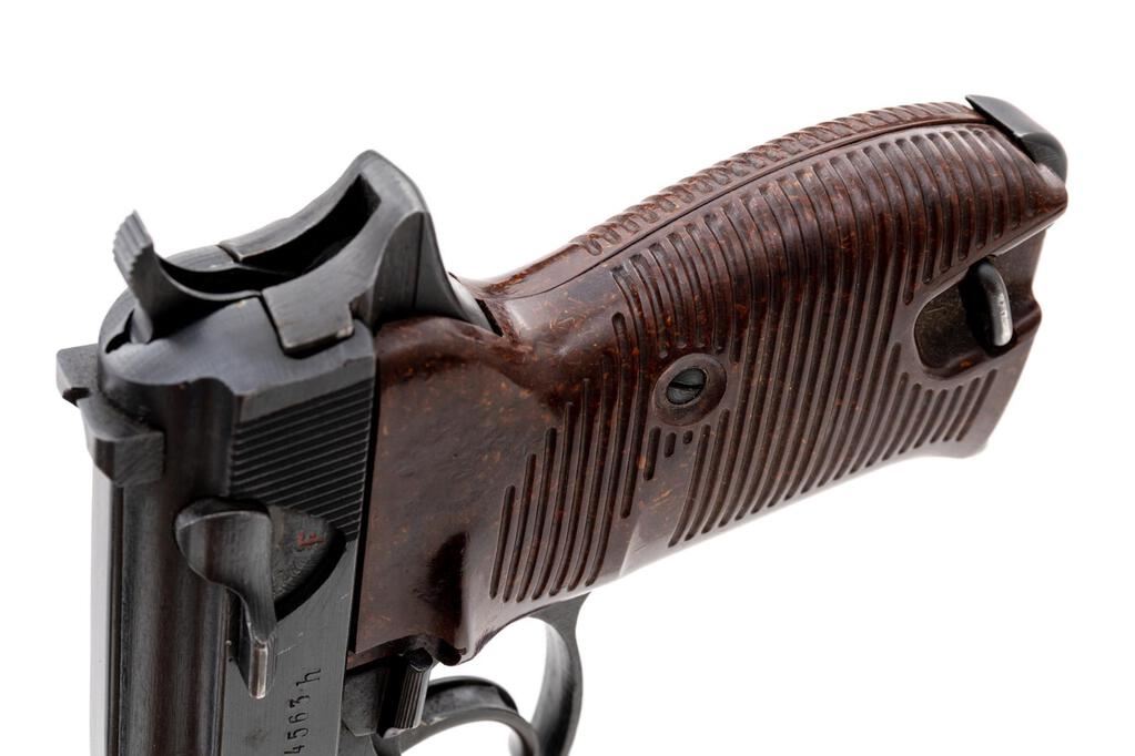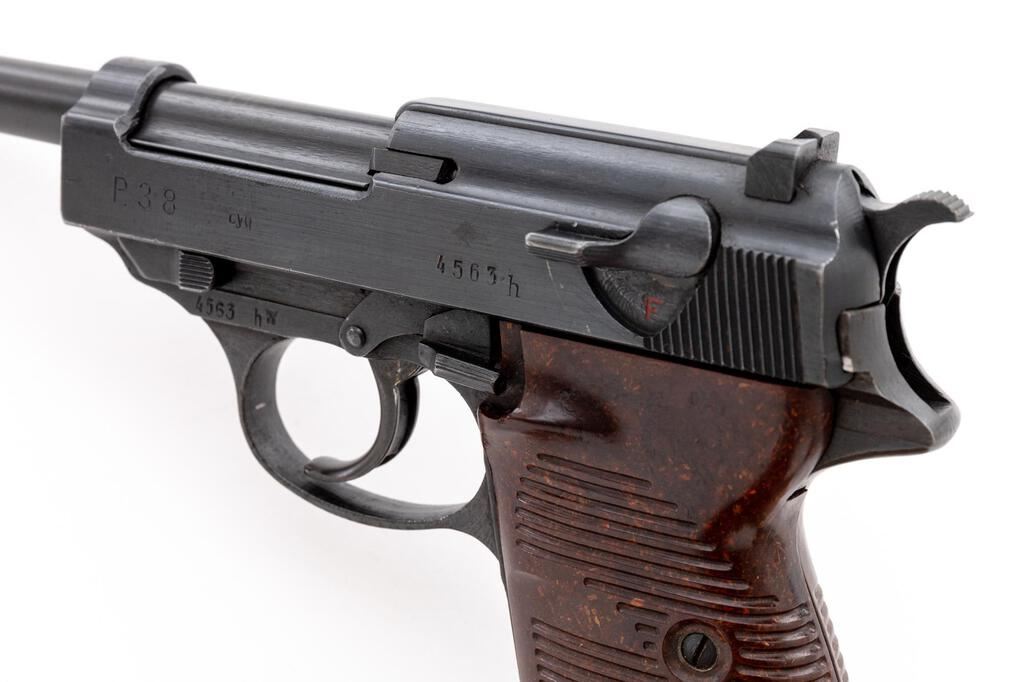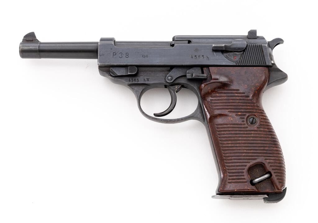 WWII German P-38 cyq Semi-Automatic Pistol, #4563h, 9mm, 5" barrel, blued finish, double action, Nazi eagle firing proof on slide, "(eagle)88" waffenampts on frame and slide, hammer drop safety, drift adjustable blade front sight, fixed rear sight with small "u" slot, all visible numbers matching, lanyard loop, bottom mag release, light brown Bakelite grooved grips, one blued steel magazine marked "jvd" with small "(eagle)88" proof on the rear spine. Condition is near excellent retaining approx. 98% original blued finish, with only the slightest wear at the muzzle, front edge of slide, tops of the sights, and tip of the safety lever. Top of the front portion of the slide has a couple of light freckles of rust. Front grip strap has light freckling and is thinning ever so slightly. Action is coated with dried grease making it sluggish, but everything seems to function properly and would benefit from a good cleaning and lubrication. Bore is bright and shiny. Grips show light wear and age, with the right grip having a large chip missing at the top right edge. Magazine shows light wear and lines from use, with the base plate showing edgewear and freckling. Est.: $1,000-$1,500. (C&R/PPT)