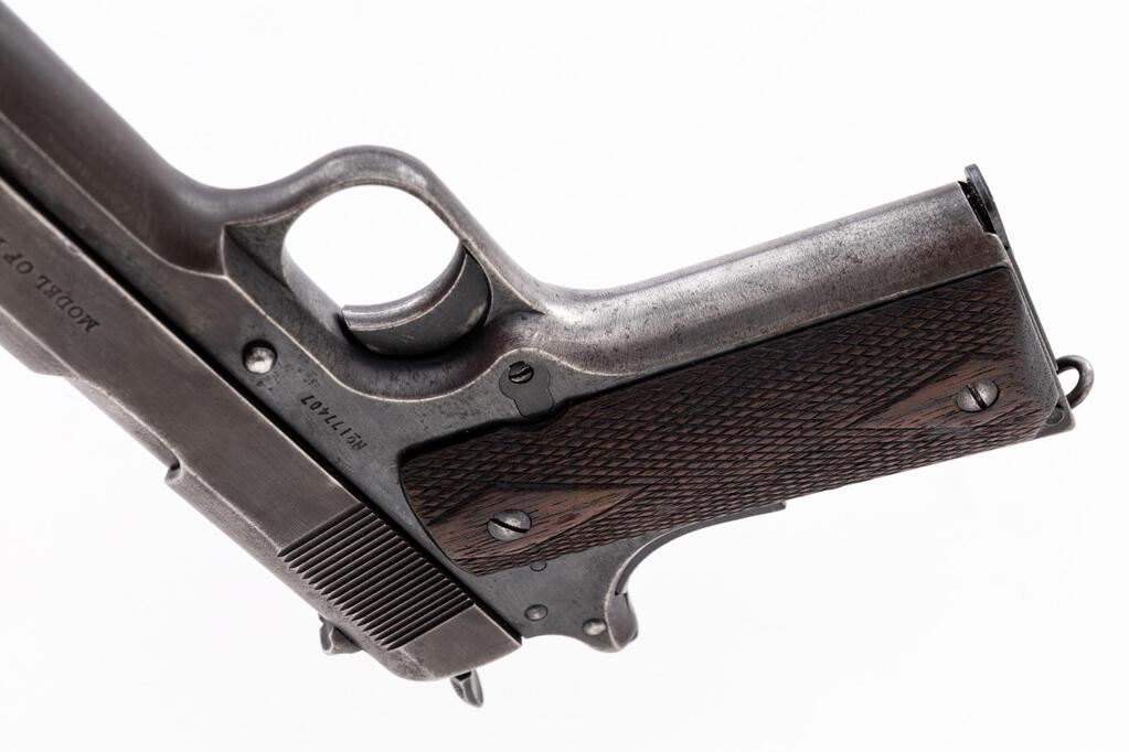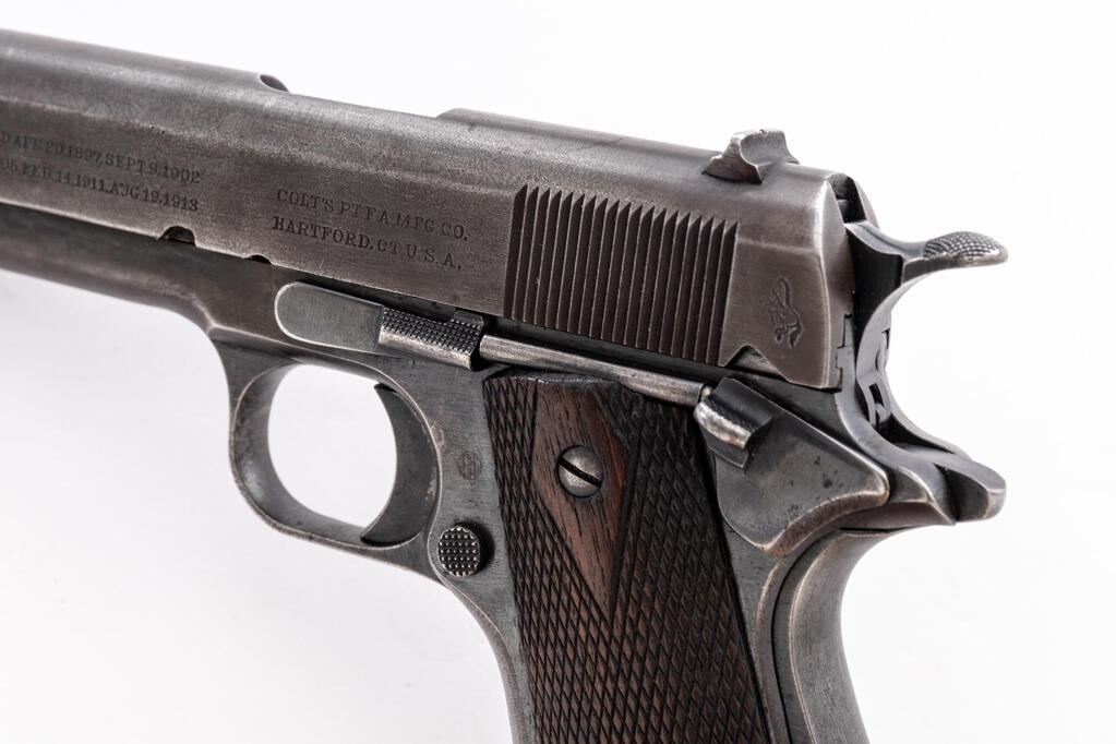 Colt Model of 1911 U.S. Army Semi-Automatic Pistol, #177407, .45 ACP cal., 5" barrel, blued finish, slide marked with Colt address, patent dates, and rampant colt logo, other side marked "Model of 1911...", with the U.S. Army marking ground off. Frame has had the "U.S. Government Property" stamping ground off. Small round "GHS" Army inspector's stamp on left side of frame. Frame and slide have different finishes, the frame looks like partial original bluing, the slide has had the finish removed or was lightly parkerized. Fixed thin blade front sight and drift adjustable rear sight with small "u" notch, grip safety, smooth mainspring housing, lanyard loop, unmarked blued steel barrel with polished chamber area, checkered wood grips with large diamonds around the grip screws, and one modern replacement blued steel magazine. Condition is good, the slide having a light brown color to the metal, with edgewear on the front, high edges of the sides, tops of the sights, wear on sides and slide serrations, and lines from firing on the lower front. Frame shows a cold blue touchup where the property marking was removed, some remnants of original bluing mostly around the area of the grips, heavy wear to the front grip strap, a mostly brown patina to the trigger guard and front of the frame, thinning and wear to the mainspring housing and grip safety. Small parts retain some of their bright blued original finish but are showing wear and age from use. Action and safeties function properly, but the hold open feature does not work with the current magazine; bore is lightly frosted with light leading and may improve with a good cleaning. Grips show soiling, wear, heavy flattening to the diamonds, light scratches, and minor gouges. Grip screws show wear and have slightly marred slots. Magazine shows wear lines from use to the blued finish. Lanyard loop is slightly bent forward. Est.: $1,000-$1,400. (C&R/PPT)