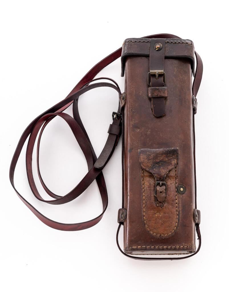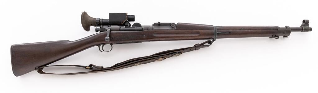 U.S. Springfield Armory Model 1903 Bolt Action Sniper Rifle, #282395, .30-06 cal., 24" barrel dated SA 12-19 with a good bore. Rifle was originally mfg'd in 1907 and rebuilt after the war, originally niter blued but now has a parkerized refinish that shows use. The finger groove stock has been sanded with handling marks, a few dents and scratches, and a visible "(circle)P" but no cartouche. Scope is a Warner & Swasey Model 1913, Serial #5587, in typical military condition, with cloudy optics that may clean and includes the scope case. The rubber eyepiece is pliable and in good condition. There is old black paint on the scope body, which is typical of military use. The leather scope case was made by Diamond Co. and marked on the back with inspector's initials. Scope case is in good condition having some crazing, with a new-made shoulder strap and closing strap. Included is a M1907 sling with a unit disc attached and a nickel oiler stored in the buttstock. Est.: $2,600-$3,400. (C&R)