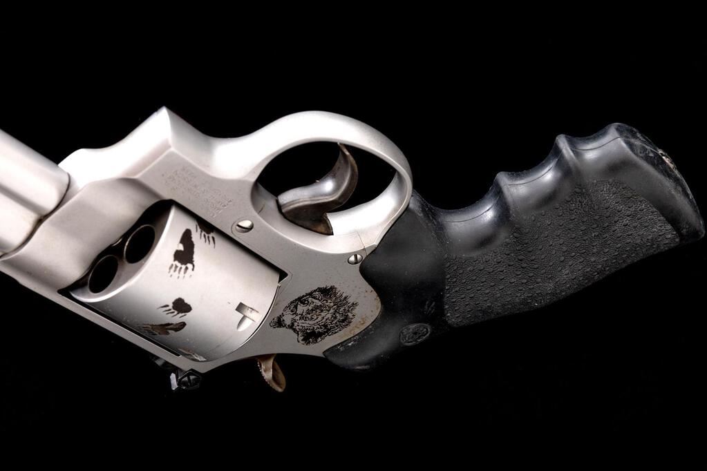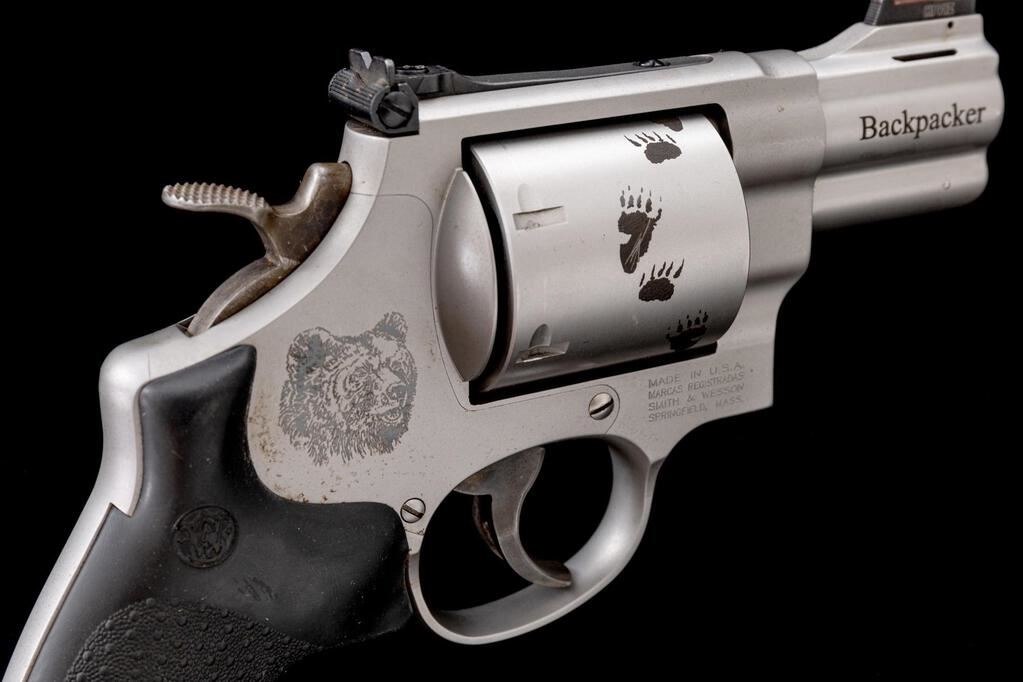 Smith & Wesson Model 629-6 Backpacker Double Action Revolver, #CMK5775, .44 Magnum cal., 2.5" ported barrel, red fiber optic Hi-Viz front and adjustable rear sights, unfluted 6-shot cylinder with embossed bear paw tracks, satin stainless steel finish, Hogue one-piece textured rubber combat grips. In a S&W blue plastic factory case. Production of the Backpacker began in 1994 and has since been discontinued. Pistol is in near excellent condition with light handling marks and some dried oil on the frame that should clean. There is minimal powder burn at the front of the cylinder with a light index line on the cylinder. There is a Grizzly bear depiction on the right side of the frame, with "Backpacker" on the right side of the barrel. Grips are very good and fit well. Est.: $1,000-$1,200. (Modern/PPT)
