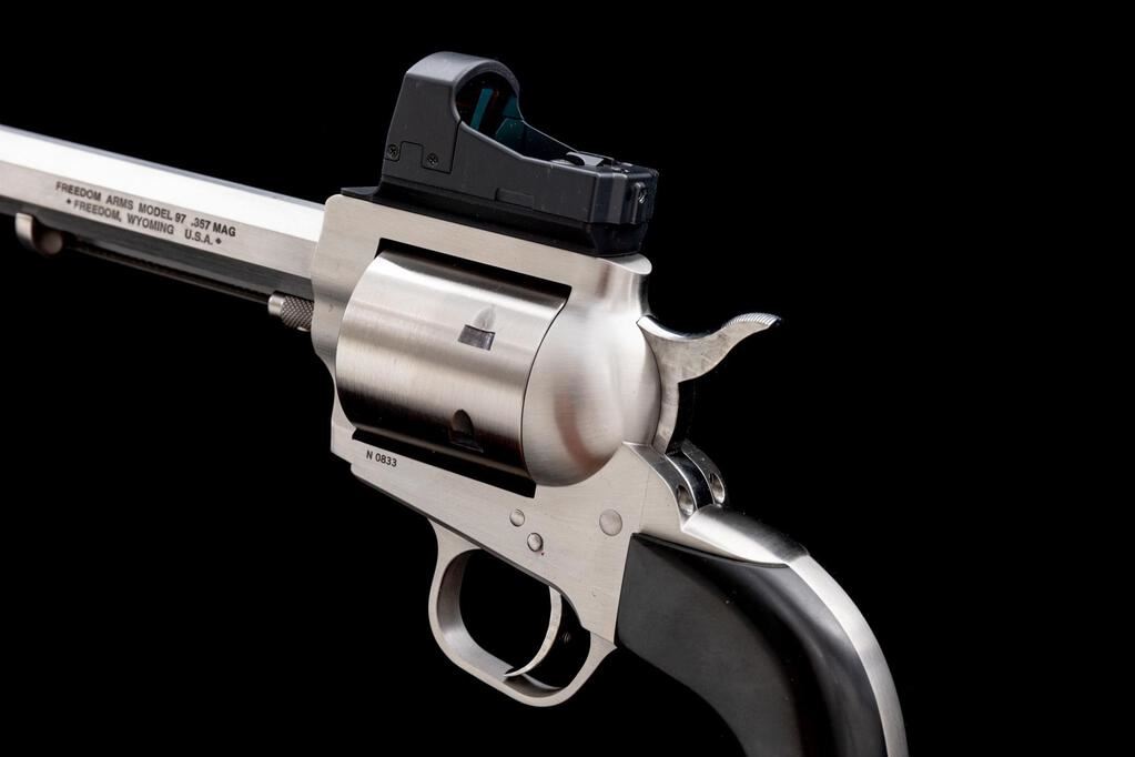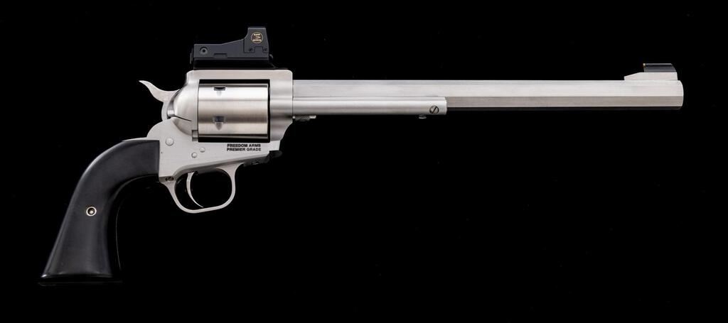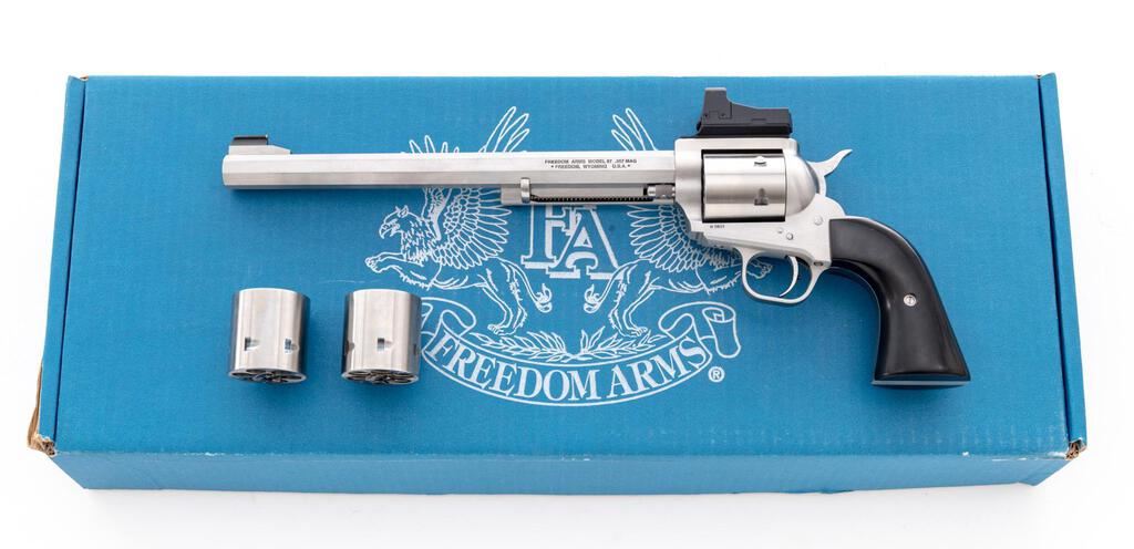 Freedom Arms Model 97 Premier Grade Single Action Revolver, #N0833, .357 Rem. Magnum cal., 6-shot, 10'' octagon barrel, brushed stainless finish, black impregnated hardwood grips, jeweled hammer and trigger, ramped blade front sight and Pride Fowler Special Ops Compact Sight 5 MOA red dot. Condition is excellent showing little use. Cylinder chambers and face are clean. Action cycles smoothly, cylinder locks up tight, bore is bright with strong rifling. Includes factory box with matching end label, factory paperwork, test target, and 2 additional 6-shot cylinders, both in excellent condition, one chambered for .38 Special, the other for 9mm. Est.: $2,000-$2,500. (Modern/PPT)