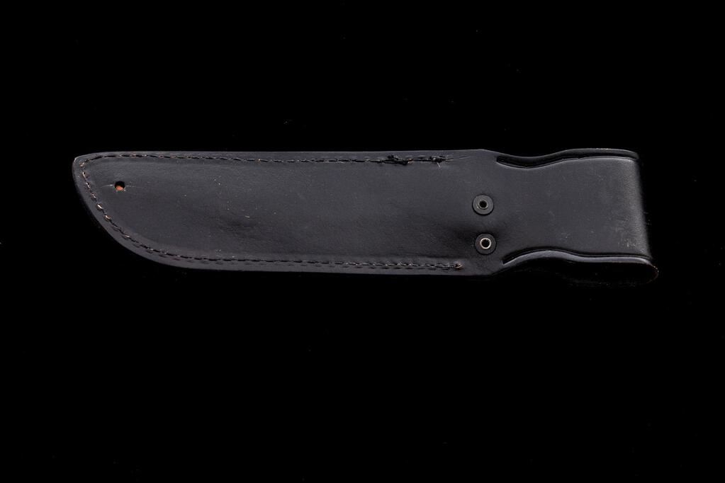 SOG Vietnam 5th Special Forces Group S1 Bowie Knife, 6-3/8" black clip point blade, 11-1/8" overall, stacked leather washer handle with finger grooves, blackened full guard and butt cap. Marked on one side of the blade with SOG logo; opposite side is marked "Seki-Japan", "Vietnam 5th Special Forces Group", and has the Special Forces "De Oppresso Liber" logo. Includes the original black leather SOG sheath, white sharpening stone, and box. Knife is in excellent unused condition. Stacked leather washers, guard, and butt cap show a few light handling marks. Sheath is also excellent with a few light scratches to the belt loop. Box is good, showing some creasing and damage to the corners; end label is clear. Est.: $500-$700.