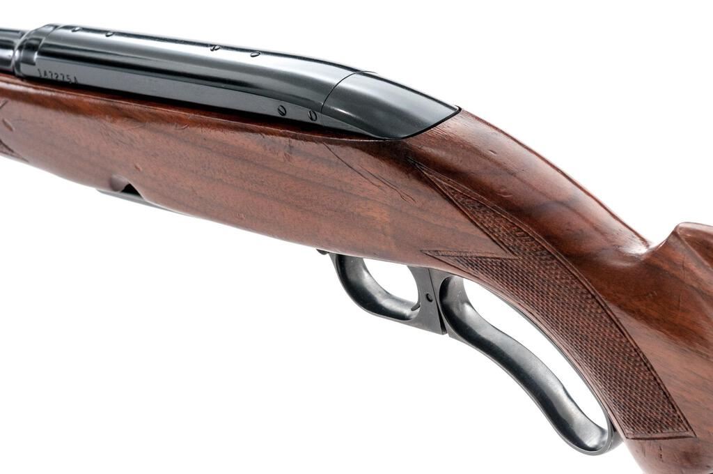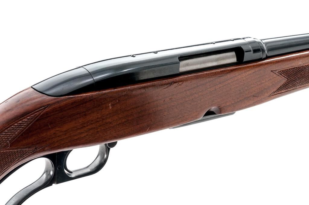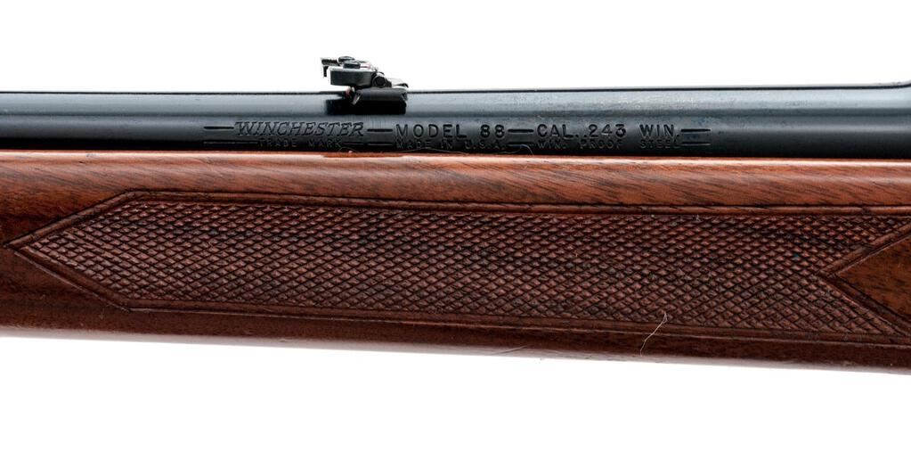 Winchester Model 88 Lever Action Rifle, #147275A, .243 Win. cal., 22" barrel, hooded ramped blade with steel bead front and folding rear sights, blue finish, checkered walnut one-piece pistol grip stock with sling swivels and a checkered plastic buttplate, with 4-rd. detachable box magazine. Mfg'd 1963. Rifle is in near excellent overall condition retaining approx. 96%-98% factory finish, showing light handling marks only. Receiver is factory drilled and tapped for scope mounting and for an aperture sight. There are crisp Winchester "WP" proof marks on the barrel and front ring. Checkered walnut stock is very good + with small mars and handling marks. A checkered plastic buttplate provides a 13-7/8" LOP. Action is crisp, bore is very good. Est.: $800-$1,200. (C&R)