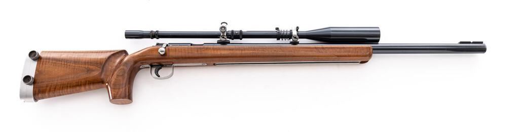Custom Erma Deutsches Sportmodell Single Shot Bolt Action Rifle, with J.W. Fecker Scope, #10324, .22 LR cal., replacement 28" heavy barrel is unmarked as to the mfg'r. One-piece pistol grip target stock with cheekpiece, adjustable aluminum buttplate, forend with inlaid aluminum accessory channel. Buttstock is missing the adjustable pad that fits into the dovetailed slot. Barrel has a sight block mounted at the muzzle and two rear blocks for scope mounting. Right rear portion of the receiver is drilled and tapped, stock is notched for a sight. Topped with a J.W. Fecker 16x1-5/8" target scope with recoil spring, and aluminum J.W. Fecker mounts. Scope has a blue finish, fine crosshair reticle, and threaded aluminum covers; overall length is 25 7/8". Matching numbered bolt, with standard "(crown)B" and "(crown)U" proof marks. Trigger with added shoe; trigger pull is approx. 1.5 lbs. Length of pull to end of wood is 11.5"; 13" to end of aluminum buttplate. Weight with the scope is approx. 15 lbs. Condition is very good as configured retaining approx. 95% blue with light scratching and thinning to the barrel. Factory lettering on the receiver is clear. Stock has scattered surface dents and scratches. There is one deeper impression to right side of the forend, and the edge is chipped at the receiver sight cutout. Action is crisp and operates smoothly; bore is bright with well-defined rifling. There are minor blemishes visible on the outside of the scope; optics are clear except for a few small dark specks around the perimeter. Est.: $1,200-$1,800. (C&R)