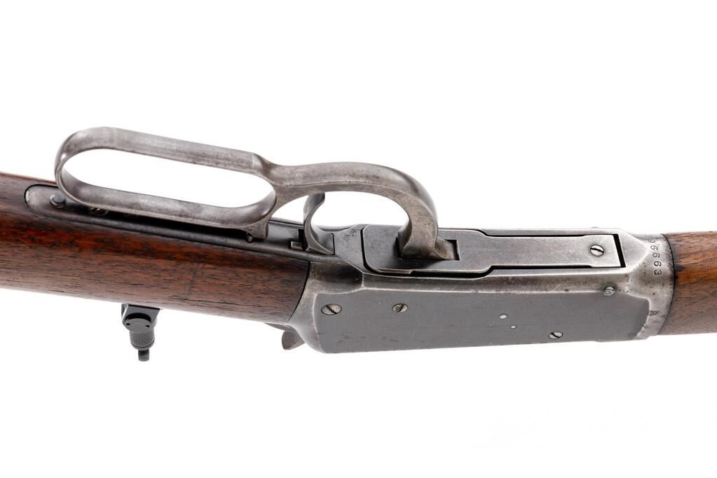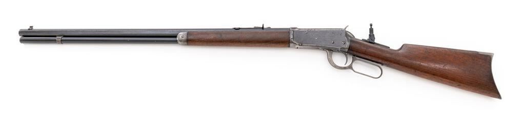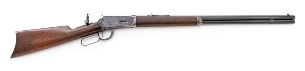 Winchester Model 1894 Lever Action Rifle, #396663, .30 W.C.F. (.30-30) cal., 26" octagonal barrel has standard markings incl. caliber at breech, tall bead/blade front sight, sliding adjustable rear (marked "Pat. Feb. 5, 1901"); receiver has "Marbles Arms" windage/elevation peep tang sight. Oil-finished walnut forearm with steel nosecap, matching buttstock a crescent buttplate. Mfg'd 1907. Condition is near excellent retaining approx. 90% smooth barrel and mag blue, 70% thinning receiver blue, gray buttplate, sharp edges and markings. Stocks are sound and smooth having light dings (moderate at right butt). Tang sight is modern. Action is crisp, bright bore shows light frosting, deep and sharp rifling. Est.: $1,800-$2,400. (C&R)