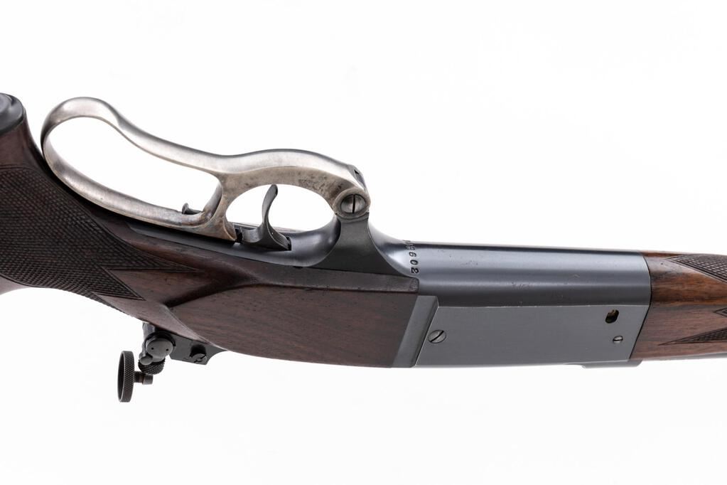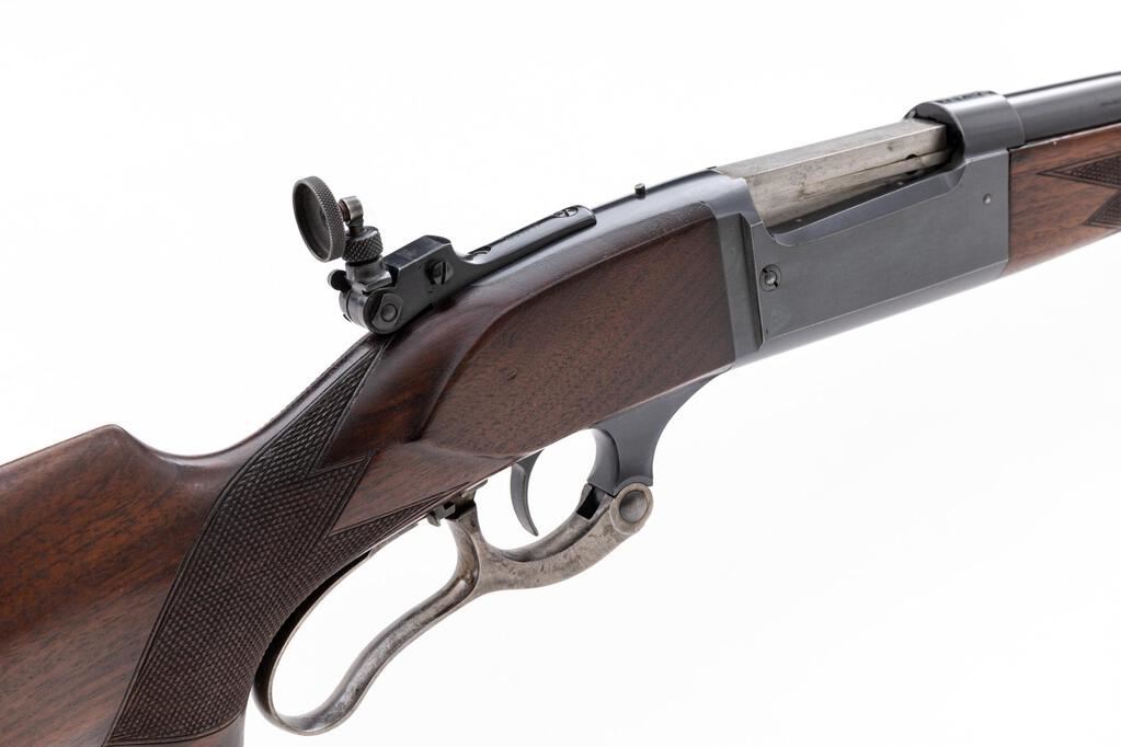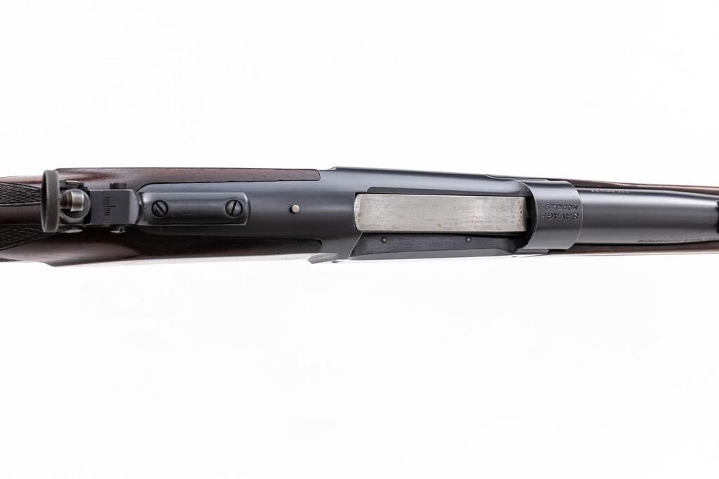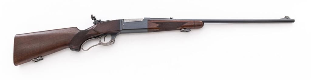 Savage Model 99RS Pre-War Lever Action Rifle, #343602, .300 Sav. cal., 24" barrel, brass bead ramped blade front and two-leaf folding rear sights, blue finish, internal rotary magazine, brass cartridge counter, checkered wood two-piece pistol grip stock with sling swivels and a ribbed steel Savage marked buttplate, period Lyman aperture sight at the rear of the receiver. Mfg'd 1933. Rifle is in fine overall condition retaining approx. 90%-92% toning blue finish, with scratches and mars consistent with field use. There is even highpoint edgewear along the receiver, and it has not been drilled and tapped. Lever assembly retains significant muted case hardening, particularly in protected areas. Stock is very good with dents and compressions. There are a couple small mars on the left side of the forend. The ribbed steel buttplate is marked "SVG" and provides a 13-3/4" LOP. Action functions smoothly, bore is good with strong rifling. Est.: $800-$1,000. (C&R)