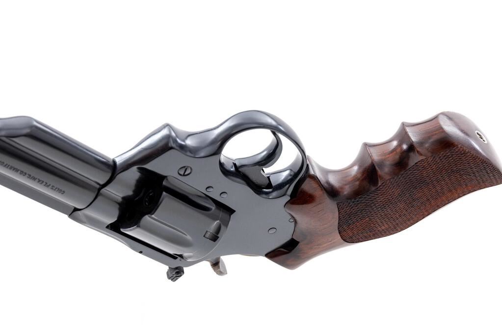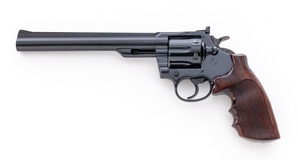 Colt Trooper MK III Double Action Revolver, #Y38712, .22 LR cal., 8" barrel with solid rib, blue finish, replacement checkered hardwood grips with finger grooves, ramped blade front sight and fully adjustable square-notched rear sight, with color case hardened hammer. Mfg'd 1980. Condition is excellent retaining approx. 98% factory blue. Metal with intermittent slight handling marks, factory lettering is crisp. Case colors are strong and nearly all remain. Grips are also excellent with only minor handling marks, checkering is sharp. Action operates smoothly and locks up securely. Mirror bright bore has well-defined rifling. Est.: $800-$1,200. (Modern/PPT)