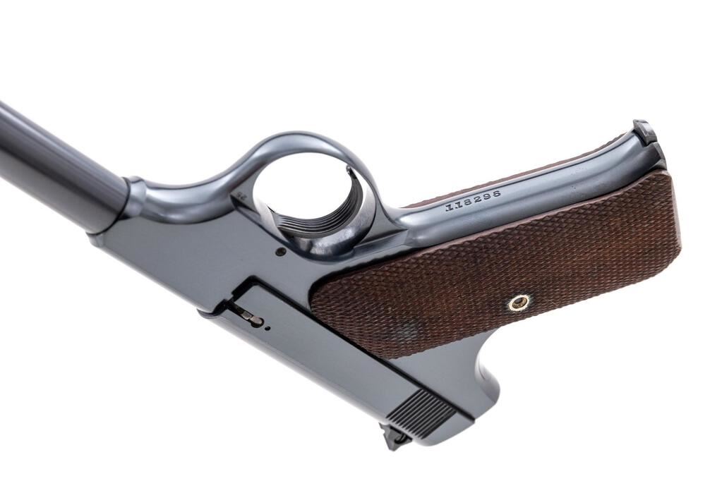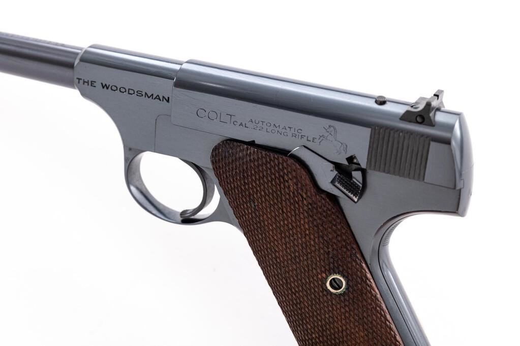 Colt Woodsman 1st Series Target Model Semi-Automatic Pistol, #118296, .22 LR cal., 6-5/8" barrel, blue finish, checkered walnut grips, elevation adjustable blade front sight and windage adjustable rear sight, with one 10-rd. Colt magazine. Magazine base is marked "COLT WOODSMAN/CAL. 22 L.R." Mfg'd 1937. Condition is excellent retaining approx. 97% factory blue. There is some slight wear at the muzzle, as well as intermittent light handling marks, and a few minor scratches. Factory lettering is clear. Grips are excellent, checkering detail is primarily crisp, showing a few typical light blemishes. Action operates smoothly. Bore appears excellent and is mirror bright with well-defined rifling. Est.: $900-$1,200. (C&R)
