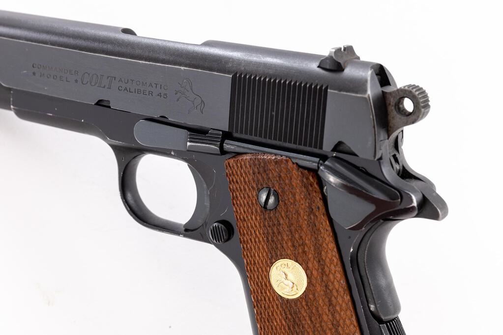 Colt Series 70 Lightweight Commander Semi-Automatic Pistol, #CLW038418, .45 ACP cal., 4-1/4" barrel, blue finish, alloy frame, checkered walnut grips with gold Colt medallions, standard blade front and square-notched rear sights. Includes one blued steel Colt magazine. Mfg'd 1978. Condition is very good retaining approx. 90% factory blue. Metal finish shows general light edgewear and handling marks. Blemishes to the front and back strap account for much of the finish loss. Factory lettering is clear. Right grip shows moderate handling wear. Checkering detail on the left grip is primarily crisp, medallion is bright. Action operates smoothly. Bore is good, bright, rifling shows moderate wear but is still clearly defined. Est.: $900-$1,200. (Modern/PPT)