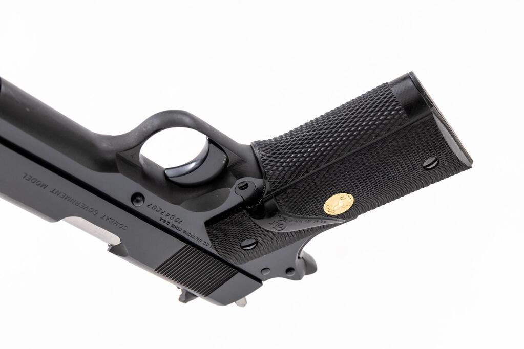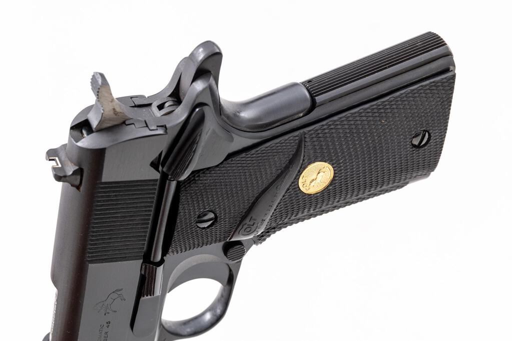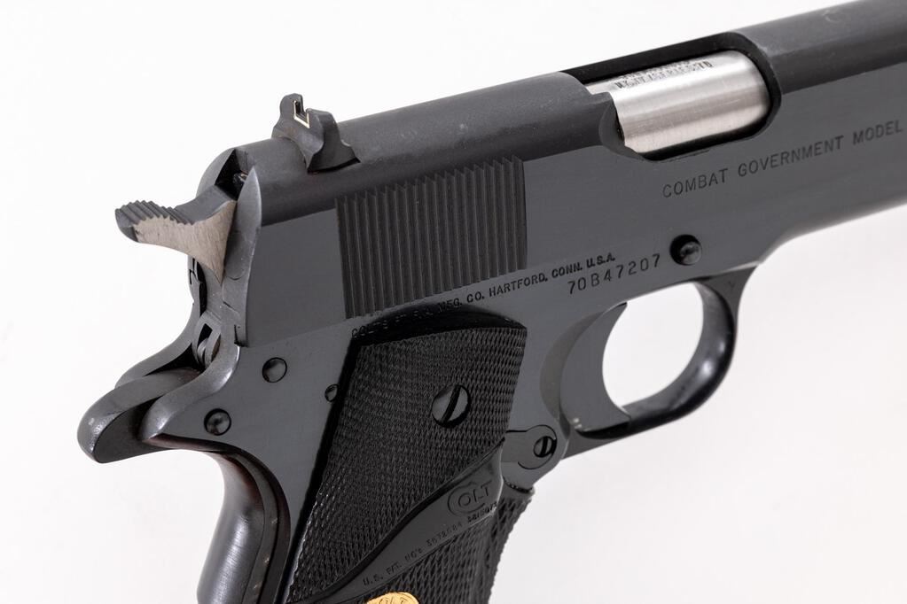 Colt Series 70 Combat Government Semi-Automatic Pistol, #70B47207, .45 ACP cal., 5" barrel, dark blue finish, checkered black rubber Colt/Pachmayr grips with gold Colt medallions, blade front sight and white outline square-notched rear sight, with one blued steel Colt magazine. Mfg'd 1982. In original wood grain pattern Colt box with matching hand numbered end label, two-piece Styrofoam insert, orange hang tag, instruction manual, and misc. factory paperwork. Condition is excellent, appearing near new, and retaining approx. 99% factory metal finish, with a few slight handling marks to the slide and left side of frame, below the slide stop. Grips are like new. Action operates smoothly. Bore is bright with clear rifling. Box shows moderate storage type wear, end label is clear. Est.: $1,400-$1,800. (Modern/PPT)