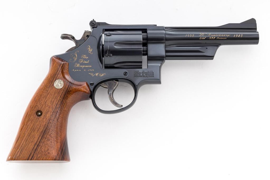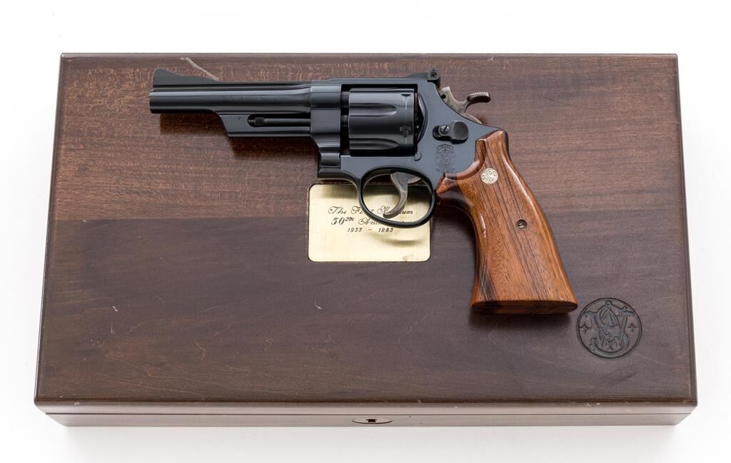 Smith & Wesson Model 27-3 Commemorative .357 Magnum 50th Anniversary Double Action Revolver, #REG0470, .357 Mag. cal., 5" barrel, blue finish, smooth Goncalo Alves target grips, ramped blade front sight and square-notched rear sight that is adjustable for windage and elevation, color case hardened target trigger and target hammer. Revolver features standard factory lettering, additionally the right side of the frame is marked in gold "The First Magnum April 8, 1935"; right side of the barrel "1935 50th Anniversary S&W .357 Magnum 1985". Includes the original matching numbered box with sealed cleaning kit and screwdriver, protective S&W paper, instruction manual, and misc. factory paperwork. In original wood presentation case with fitted blue interior, certificate, brass plaque inlaid into lid, and key. One of 2,500 mfg'd in 1985. Revolver is in excellent overall condition and retains approx. 98%+ factory metal finish. There is a thin turn line to the cylinder and a few minor scratches to the cylinder face. Factory lettering is crisp. Case colors are strong. Grips are like new. Excellent action and bore. There are intermittent scratches to the outside of the wood case, interior is excellent. Box is in very good condition showing only light storage type wear. The label has become detached from the end panel and is now affixed to the inside of the lid. Est.: $1,000-$1,500. (C&R List/PPT)