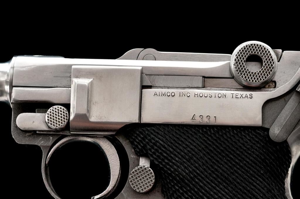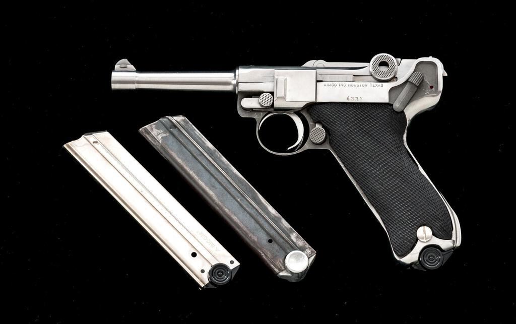 Mitchell Arms American Eagle Luger Semi-Automatic Pistol, #4331, 9mm, 4" barrel, dovetailed blade front and fixed rear sights, stainless steel, toggle action, checkered plastic two-piece grips, with 3 correct magazines. Left side of frame is maker marked "AIMCO INC HOUSTON TEXAS". Pistol is in near excellent overall condition with scattered light scratches and handling marks only. Front ring has a crisp American Eagle emblem and is dated 1991. Action functions smoothly, bore is very good with defined rifling. Est.: $1,000-$1,500. (Modern/PPT)
