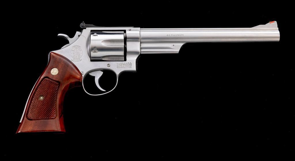 Smith & Wesson Model 629 Double Action Revolver, #N870200, .44 Mag. cal., 8-3/8" pinned barrel, satin stainless finish, checkered target grips with S&W medallions, recessed cylinder, red ramp front sight and fully adjustable square-notched with white outline rear sight, smooth target trigger and checkered target hammer. Mfg'd ca. 1980-1981. Condition is excellent. Metal with intermittent mild scratches and handling marks. Light powder marks on the cylinder face. Grips are also excellent showing little handling wear, checkering is sharp. Action cycles smoothly and locks up securely. Excellent mirror bright bore with well-defined rifling. Est.: $1,000-$1,400. (Modern/PPT)