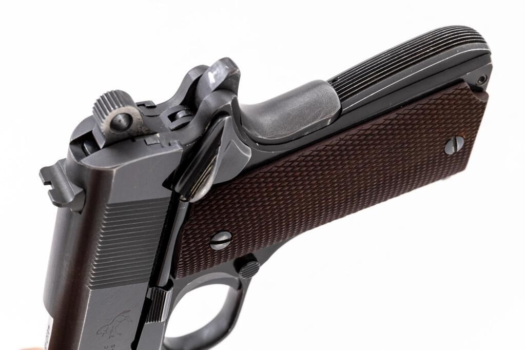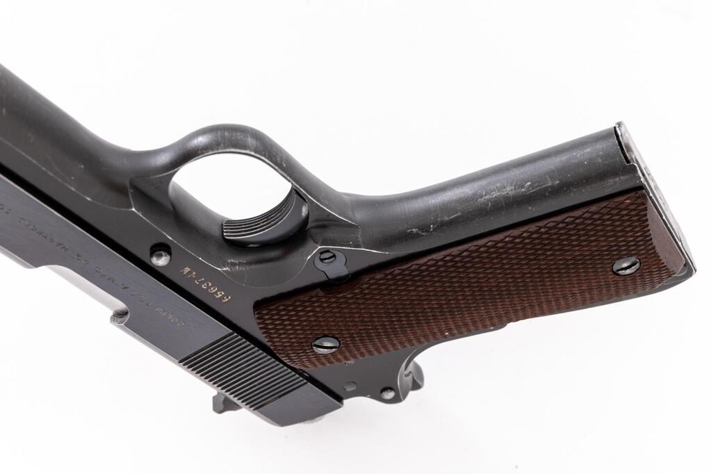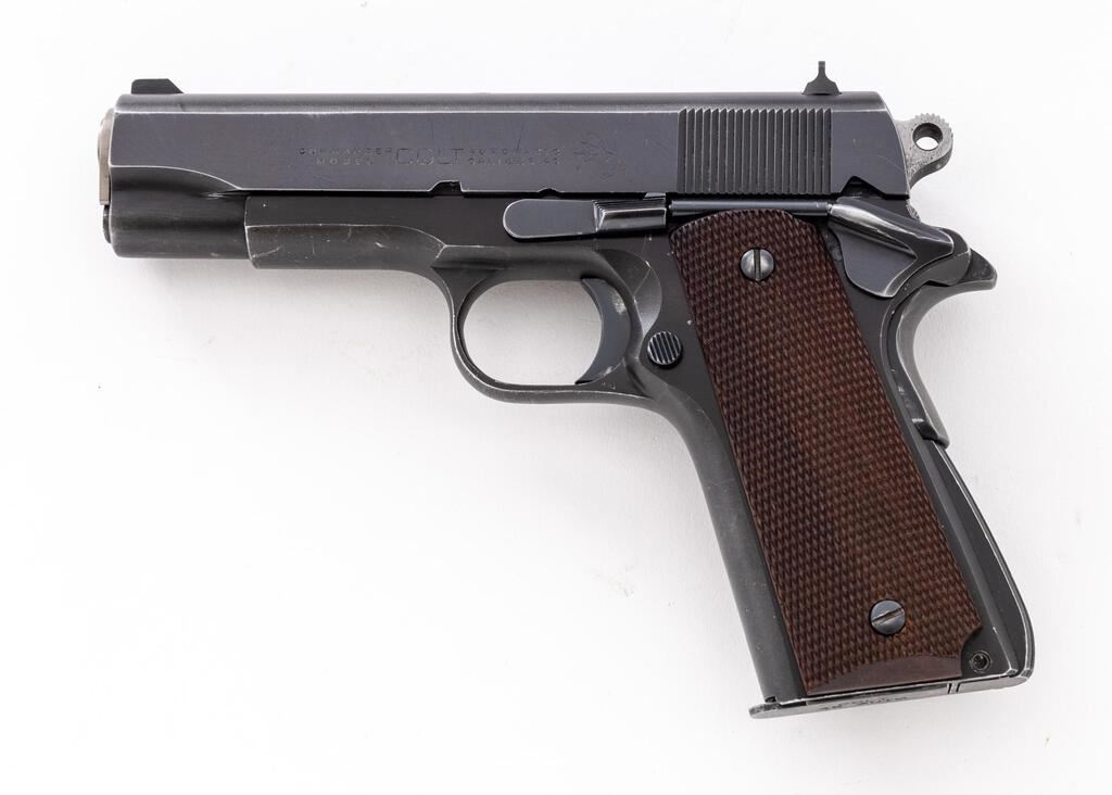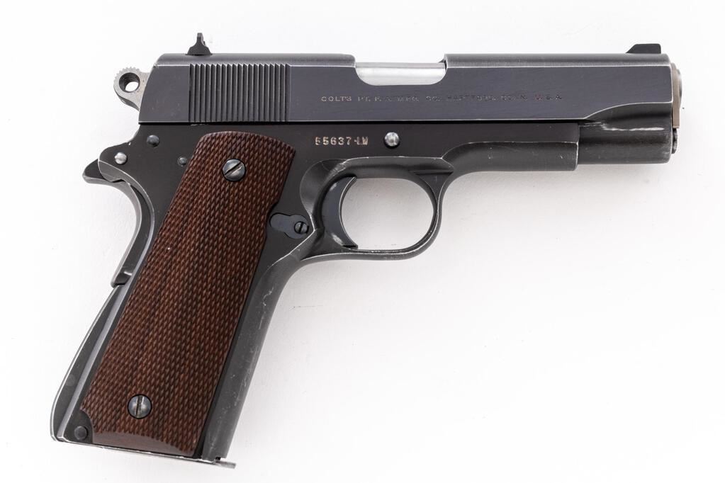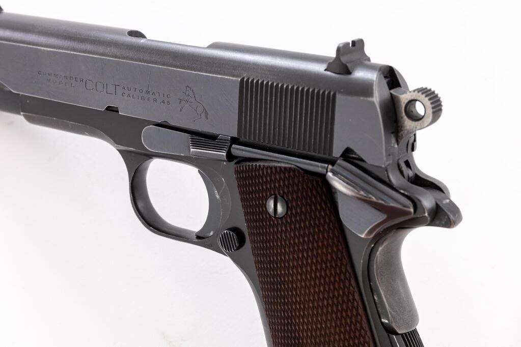 Colt Pre-Series 70 Lightweight Commander Semi-Automatic Pistol, #55637-LW, .45 ACP cal., 4-1/4" barrel, blue finish, alloy frame, checkered hardwood grips, standard blade front and square-notched rear sights. Includes one blued steel Colt magazine. Mfg'd 1968. Condition is good retaining approx. 90% factory blue, which shows some thinning; slide with mild plum colored toning. Metal with general light edgewear, handling marks, fine scratching to the slide. Wear to the front and back strap accounts for much of the finish loss. Factory lettering is clear. Grips are very good, checkering is primarily sharp, with a few moderate handling marks. Action is tight and operates smoothly. Bore is very good, bright, rifling shows typical wear but is still clearly defined. Est.: $1,000-$1,400. (C&R/PPT)