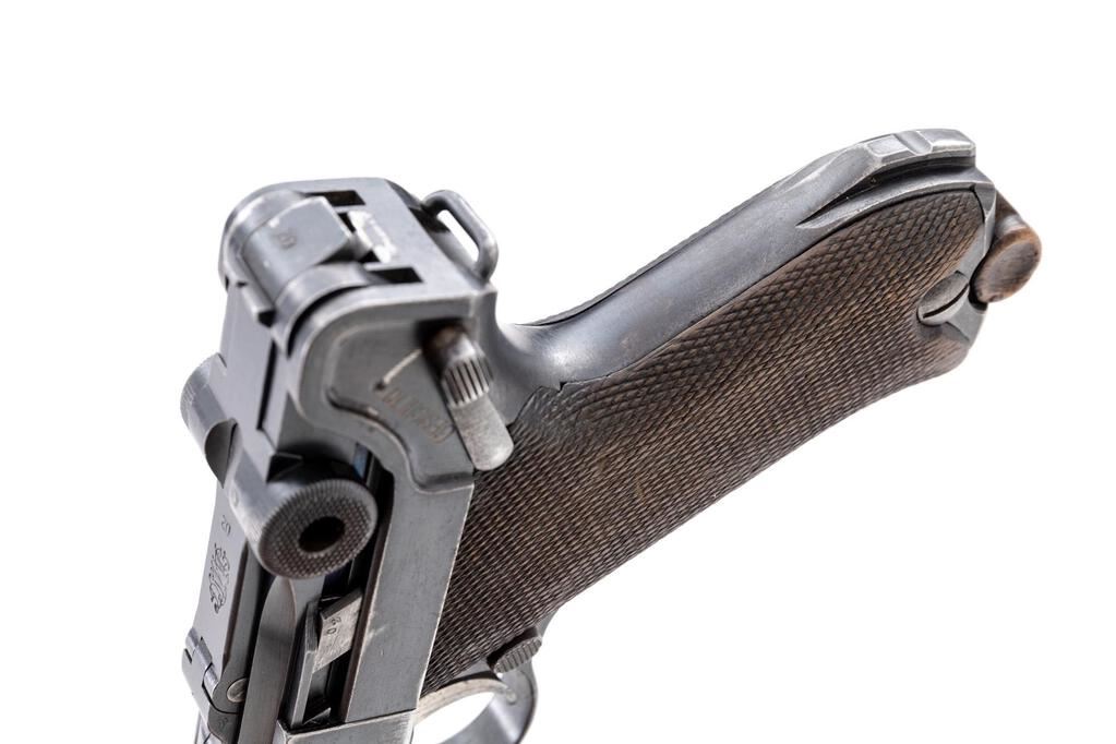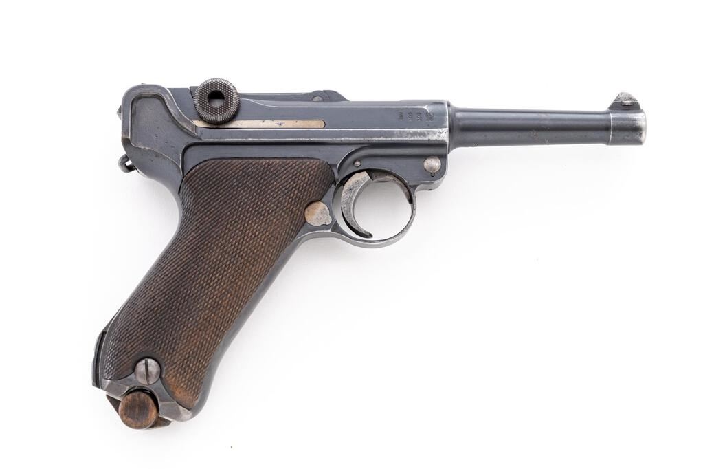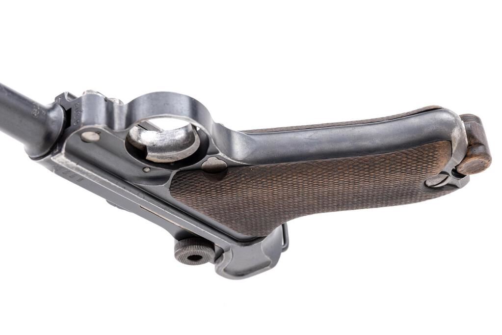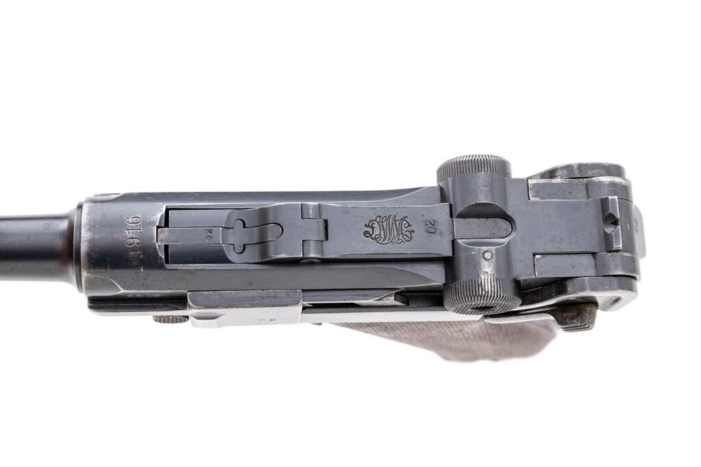 WWI German DWM 1916 P.08 Luger Semi-Automatic Pistol, #6502L, 9mm, 4" barrel, blued finish, straw and fire blued small parts, DWM marked toggle, chamber dated 1916, Imperial German firing and proof marks on right side of slide, stock lug, lanyard loop, drift adjustable inverted "V" front sight, integral fixed rear sight with small "v" notch, checkered wood grips, and one nickel-plated steel magazine with an unmarked wood base. All visible numbers match, but the sear bar has been over stamped to force match it to the gun. Condition is good retaining approx. 75% original rust blued finish, with holster wear on the sides of the muzzle, front of frame, front of slide, sideplate high edges, frame high edges, trigger guard edges, minor pitting on right front frame, sides and bottom of barrel has several large scratches. Front grip strap is very strong with just light freckling, rear grip strap shows wear from use, wear around the stock lug, mag well area, top of rear toggle, and firing marks at rear top of frame. Straw-finished small parts show wear and fading to the finish with scattered freckling. Action, hold open, and safety all function properly; bore is dark and heavily pitted, with worn lands and grooves. Grips show wear, soiling, and a few small scratches and gouges, and are correctly marked inside with the last two digits of the serial number. Grips fit the frame nicely with a minimum of movement; grip screws show thinning to the finish, with clean slots. Magazine body shows some rust, losses to the nickel plating, and wear from use; wood base shows no signs of ever being marked with numbers or proofs, shows age and light gouges around the side roundels. Est.: $800-$1,200. (C&R/PPT)