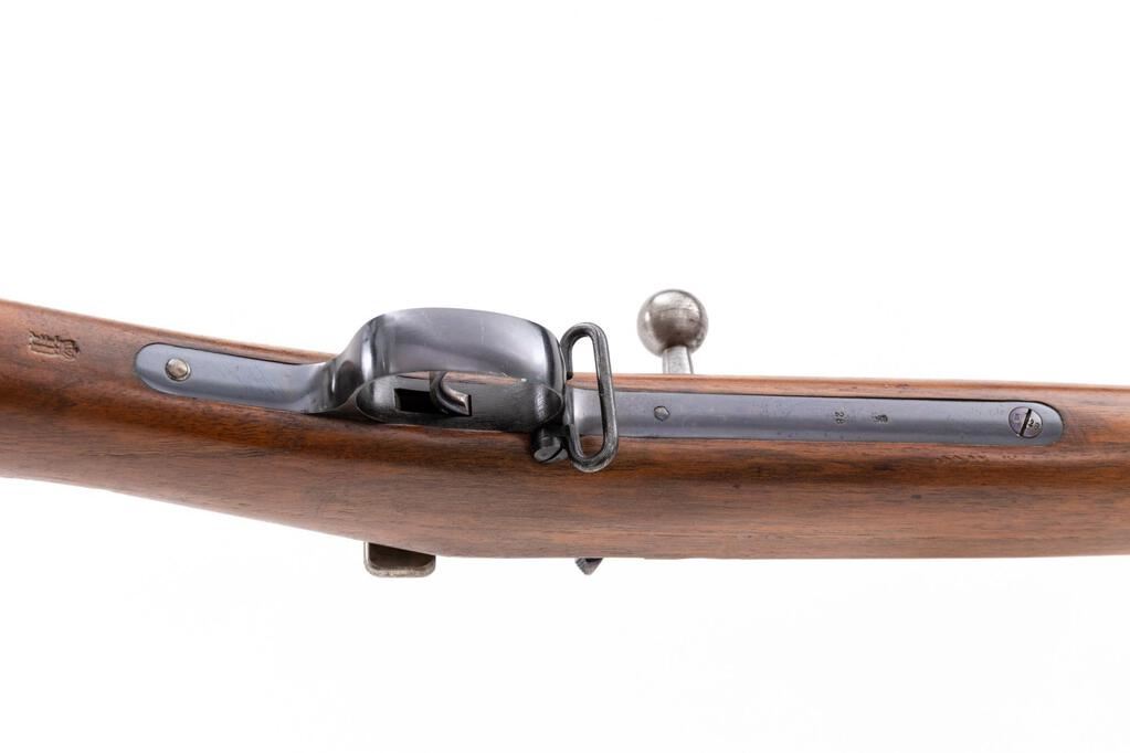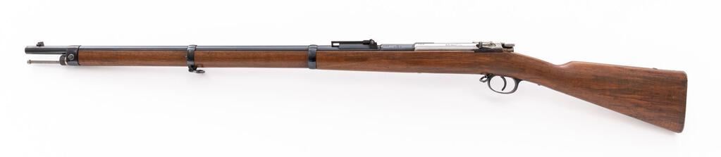 German Model 71/84 Spandau Mauser Bolt Action Rifle, #4828, 11mm x 60mm Mauser cal., 31.56" barrel, blued and in-the-white finish, drift adjustable inverted "V" fixed front sight and tangent rear sight adjustable to 1600 yards, Imperial German proof marks, with 8-rd. tubular magazine. Dated 1888, made at the Spandau Arsenal, selector for single shot or magazine feed, all visible numbers matching, straight grip walnut stock with three barrel bands, front band with side bayonet lug, stacking rod, and steel buttplate. Condition is excellent retaining most all of its original blued finish on the barrel, with some dried grease residue, scratches on the upper two barrel bands, freckling on the trigger guard strap, and light scratches and dings on the trigger guard bottom and sides. Receiver and bolt are in the white and show dried grease residue, light freckling, and minor age graying. Action and safety function properly, but a bit sticky due to the dried grease; bore is bright, with light soiling that should clean to very good. Stock shows minor dings, scratches, scuffs, and clear stamped proofs and markings. Buttplate shows light rust spots and dried grease residue. Most of these 71/84 Mausers did not see much action, and this example is in mostly unissued condition after 130 years. Est.: $1,000-$1,500. (Antique)