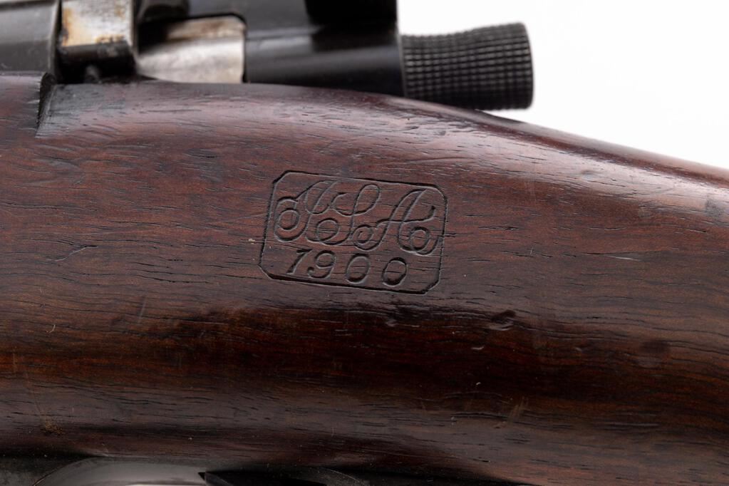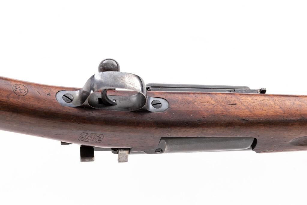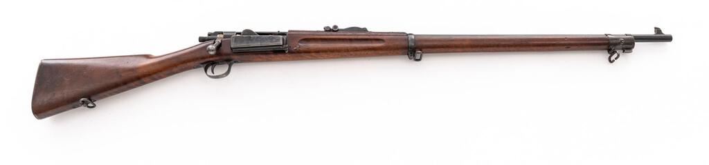 U.S. Springfield Armory Model 1898 (Krag) Bolt Action Rifle, #289995, .30/40 Krag cal. 30" barrel. Bolt and magazine both work very well but the bolt has a carbine headless cocking piece. Rear sight is a Model 1898 that was arsenal modified by re-shaping the sighting area and adding a peep. Receiver and barrel have a considerable amount of arsenal blue with light wear in some places. Trigger guard has lost finish on the bottom and the buttplate is mostly brown. Stock and hand guard are very good with light dents and scratches throughout due to military use. Stock has a build-up of linseed oil or varnish, a very good JSA/1900 cartouche on the left side, and "(circle)P" behind the trigger guard. There is a rack number 872 stamped into the right side of the stock near the buttplate. Bore shows good rifling with light erosion throughout. No cleaning rods or oiler are present. Est.: $800-$1,200. (C&R)