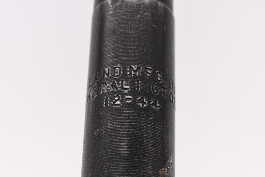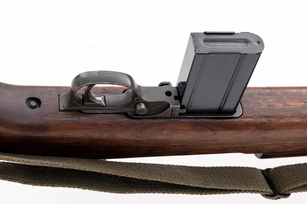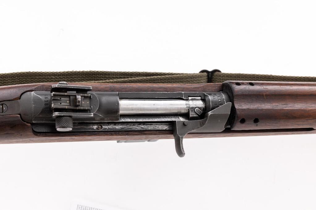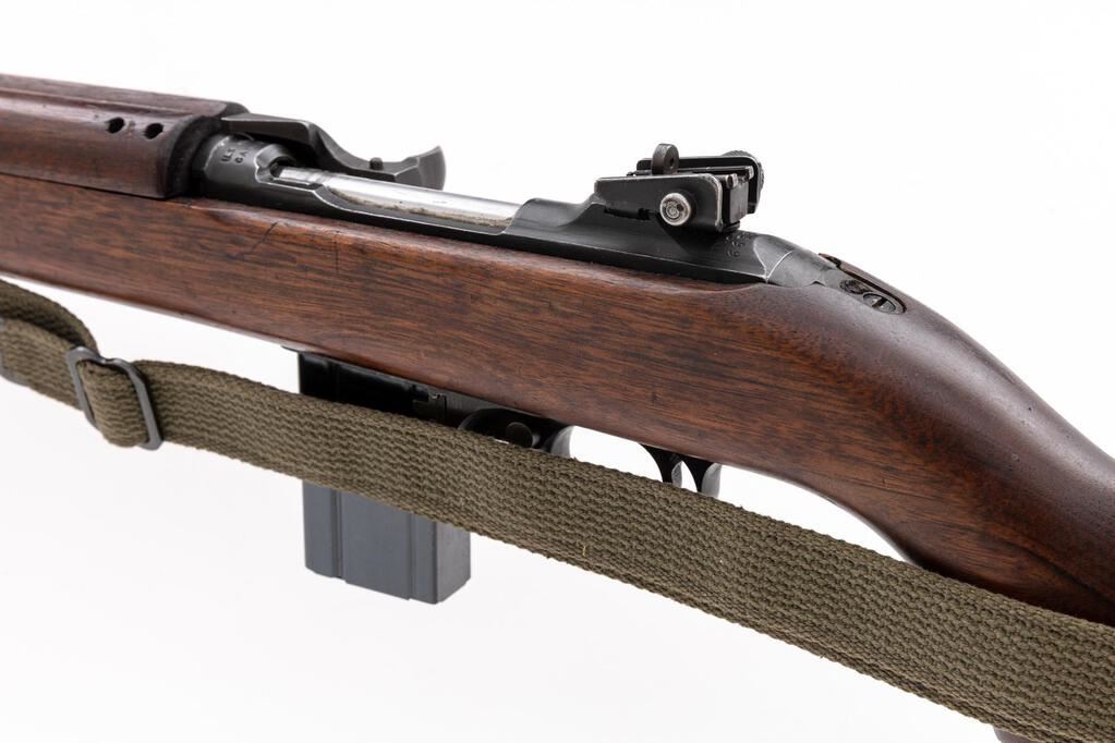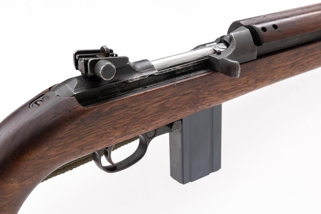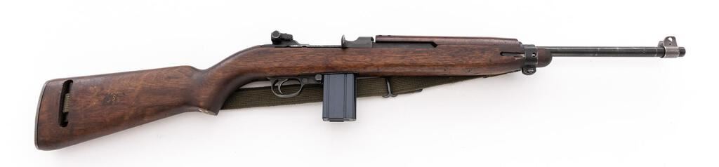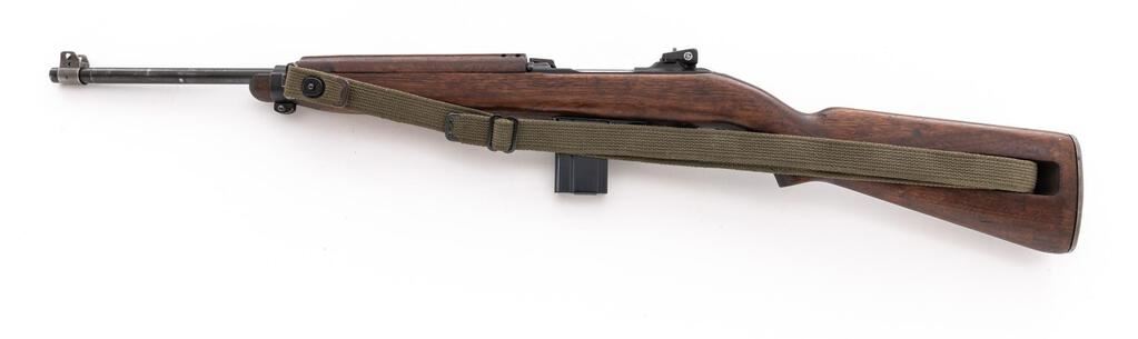 Inland M1 Semi-Automatic Carbine, #6638855, .30 Carbine cal., 18" barrel, parkerized finish, round bolt, walnut stock set, blade front sight with protectors and adjustable aperture on ramp rear sight. A U.S.G.I. oiler and excellent condition green cotton sling are attached, and an excellent condition 15-rd. magazine stamped "OIB" on the spine is fitted. Marked "INLAND DIV." on the rear receiver tang, and "U.S.CARBINE/CAL.30 M1" on top of receiver ring. Barrel behind the front sight is marked "INLAND MFG.DIV./GENERAL MOTORS/12-44". Left-side sling slot is stamped "IO"; right-side buttstock is marked with an Ordnance Dept. "Crossed Cannons" stamp; and there is a painted "26" rack number on the bottom of the pistol grip and a partially removed number on the right-side buttstock. There is a series of small impact marks along the top of the barrel. Condition overall is very good with the metal retaining approx. 85% of its dark finish. There is a small chip behind the receiver tang and chipping to the pistol grip, otherwise the wood is very good showing handling marks and darkening to the finish. Action operates smoothly, bright bore is excellent with sharp well-defined rifling. No visible import marks. Est.: $900-$1,200. (C&R/PPT)(Hi-cap mags not available to Calif. residents.)