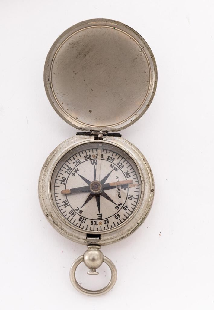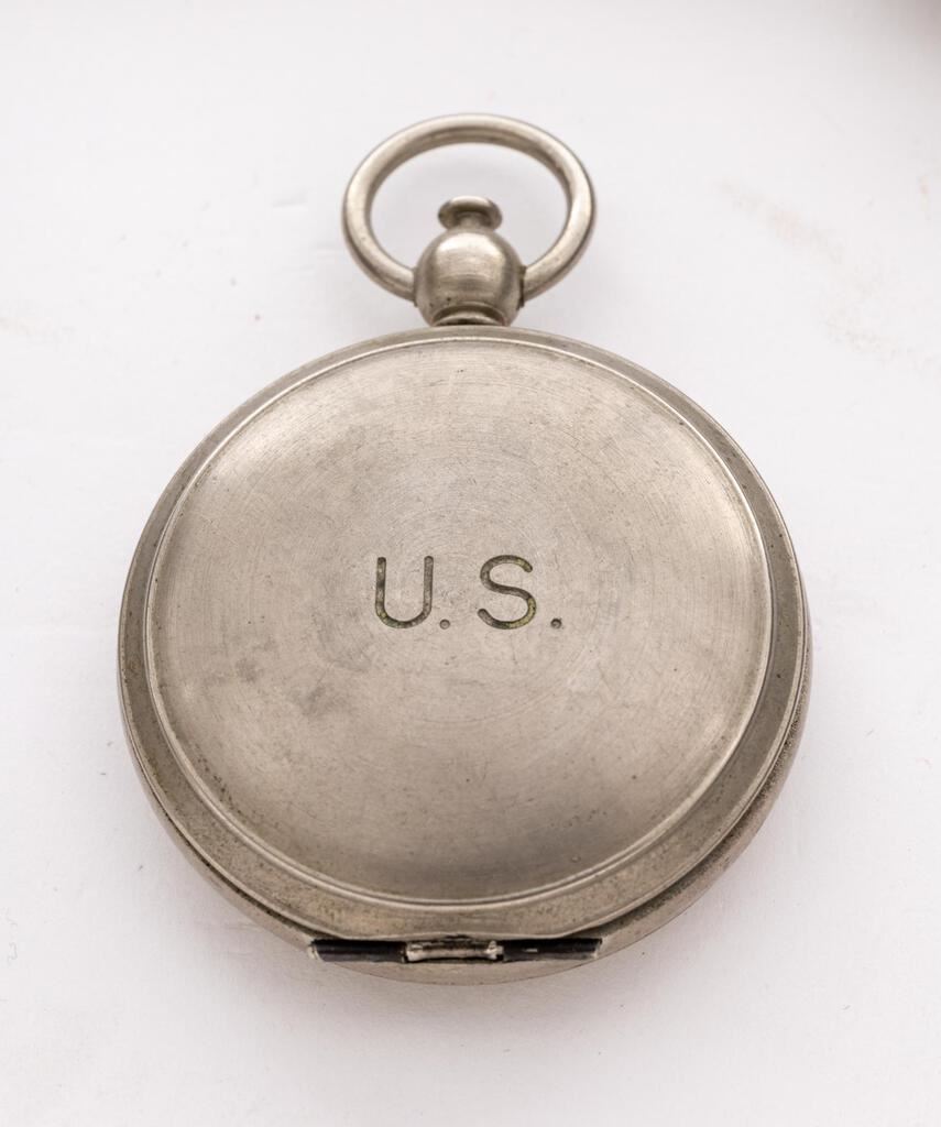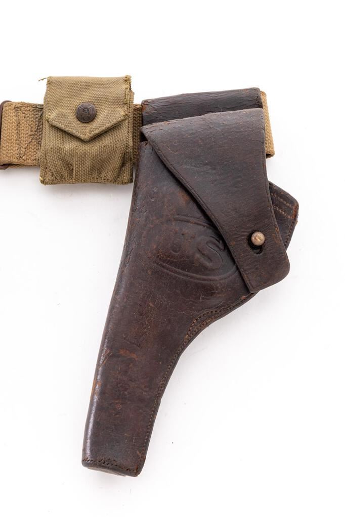 M1910 Garrison Belt Set: (1) An unusual M1910 garrison belt with interlocking U.S. buckle. In good condition with wear and staining. Buckle and belt slides have an even patina but no original finish. (2) Mills unmarked rimless eagle garrison pouch with a U.S. compass. Pouch is in fair condition; U.S. marked compass made by Wittnauer is excellent. (3) Model 1917 pouch for half-moon clips, unmarked, showing use and some staining. (4) First aid pouch L.C.C. & CO. 1918, attached with a leather slide. Good condition with use and some staining. (5) Model 1909 Rock Island Arsenal holster in fair condition. Leather is weak, especially at the flap, which was repaired using a piece of leather glued to the underside and the plug was replaced. RIA holsters were made from 1909 to 1911. Est.: $400-$600/Set.