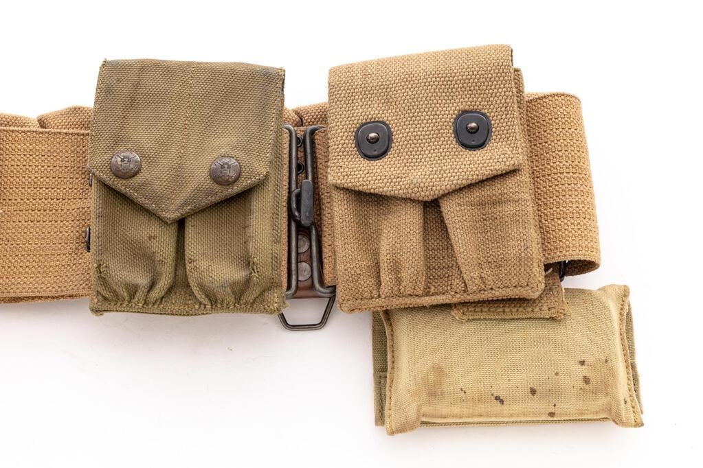 M1903 Cavalry Cartridge Belt Set: (1) M1903 cavalry cartridge belt with rimless eagle snaps, in factory new condition. Patent dates are marked on metal end caps. (2) Magazine pouch marked Russell JUNE 1918, in factory new condition. (3) Mills 1914 rimless eagle magazine pouch, with wear and spots of rust stains. (4) First aid pouch PB&CO 1917, faded with staining at the bottom. (5) Bauer & Black marked U.S. ARMY NOV. 2-1916 bandage tin, missing pull ring, with dents and areas of missing finish. (6) M1916 leather holster, marked US, with tight stitching, supple leather, and light crazing on top of the flap. The only visible marking on the back is an "AL". Est.: $300-$600/Set.