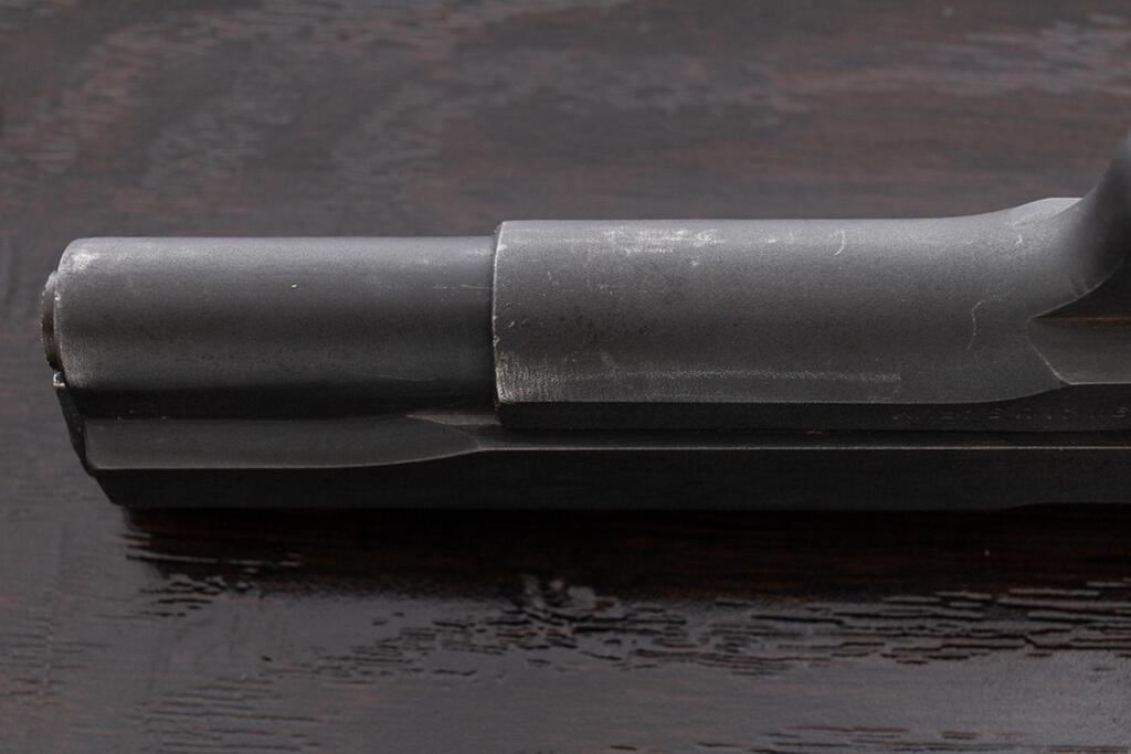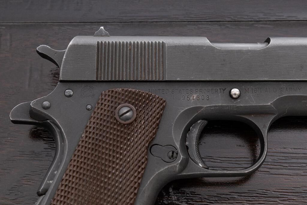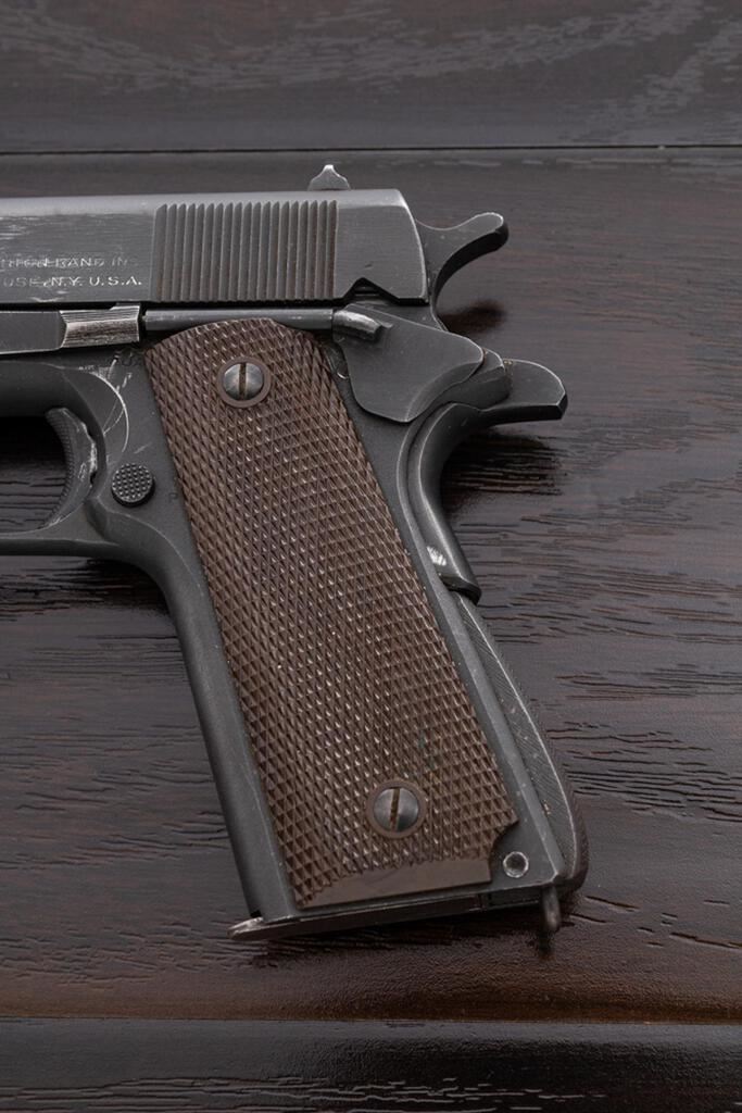 WWII Remington Rand 1911-A1 Semi-Automatic Pistol, #954303, .45 ACP cal., 5" barrel, Dulite black oxide finish, black-finished small parts, serial range for 1943 production, fixed thin blade front sight and drift adjustable fixed rear sight with small square notch, grip safety, checkered arched mainspring housing, lanyard loop, stamped steel trigger, slide marked with Remington Rand Inc. and address, small "P" proof on top of slide, FJA inspector's stamp on side of frame with "P" proof, crossed cannons proof mark, U.S. Property mark, and M 1911 A1 U.S. Army mark. Dulite black-finished barrel is marked with HS and P on the lugs, checkered brown plastic grips, and one black-finished General Shaver spot welded steel magazine. Condition is excellent retaining approx. 93% original finish, with light holster wear on the front edges of the slide, front edges of the frame, tops of the sights, light wear marks from use on the grip safety sides, hammer, and trigger, slight thinning of the finish on the safety lever and hold open lever high edges. Left side of the slide near the mfgr's markings has some wear to the finish. Typical scratches and wear on the frame by the hold open lever from disassembly. Barrel shows wear on the top chamber area from use and very light wear on the body, with mint bore. Action, hold open, and safeties all function properly. Grips are very nice, the grip screws show very light high edgewear, with clean slots. Magazine shows a two-toned finish, the top being black, the bottom with a brown plum-colored finish, with light wear marks on the body from use. Est.: $1,500-$2,000. (C&R/PPT)