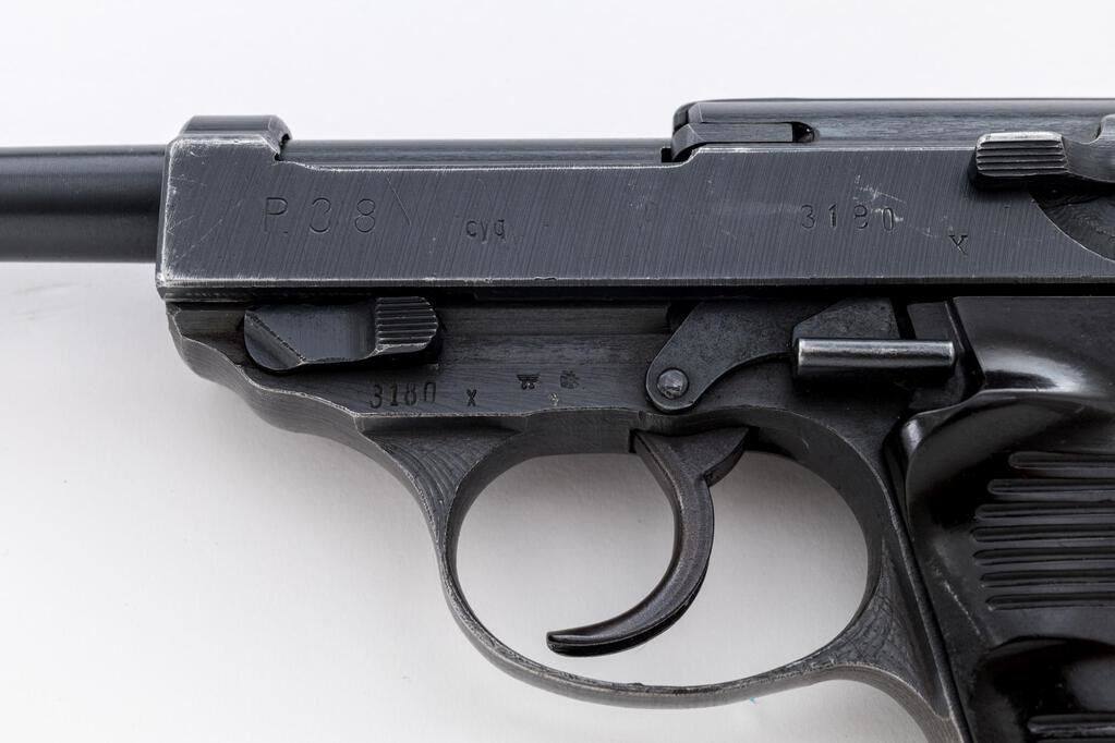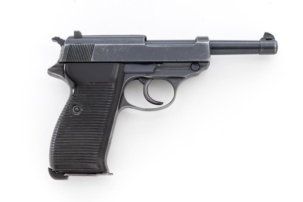 WWII German P-38 cyq Semi-Automatic Pistol, #3180x, 9mm, 5" barrel, blued finish, double action, Nazi eagle firing proof on slide, "(eagle)88" waffenampts on frame and slide, small asterisk stamp next to "(eagle)88" on frame, hammer drop safety, drift adjustable blade front sight and fixed rear sight with small "u" slot, all visible numbers matching, late type cog hammer, lanyard loop, bottom mag release, dark brown Bakelite grooved grips, one blued steel magazine with jvd marking on left side. Condition is excellent retaining approx. 85% original blued finish, with high edge holster wear on the sides of the muzzle, front and high edges of the slide, edgewear to the tops of the sights, tips of the safety and hold open levers, lanyard loop, trigger guard edges, and rear of slide. Front of the frame, trigger guard and front grip strap are fading with light freckling on the grip strap. Action, hold open, and hammer drop safety function properly; bore is bright with very light frosting. Grips show some scratches, and the right grip shows some heavy lines and light depressions. Magazine shows wear and lines from use with scattered light freckling. Est.: $1,000-$1,200. (C&R/PPT)