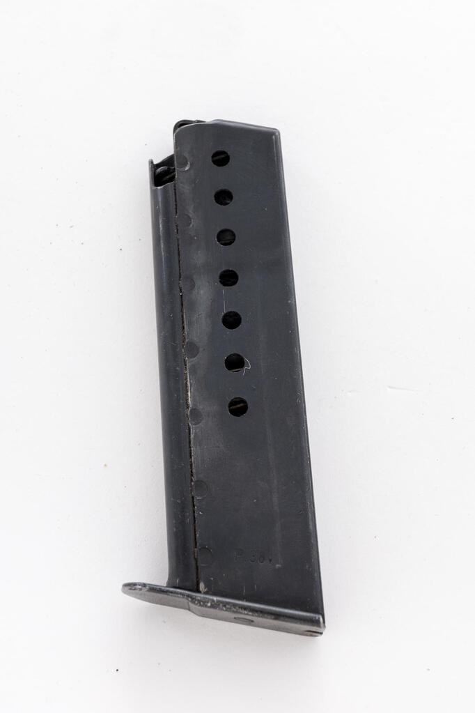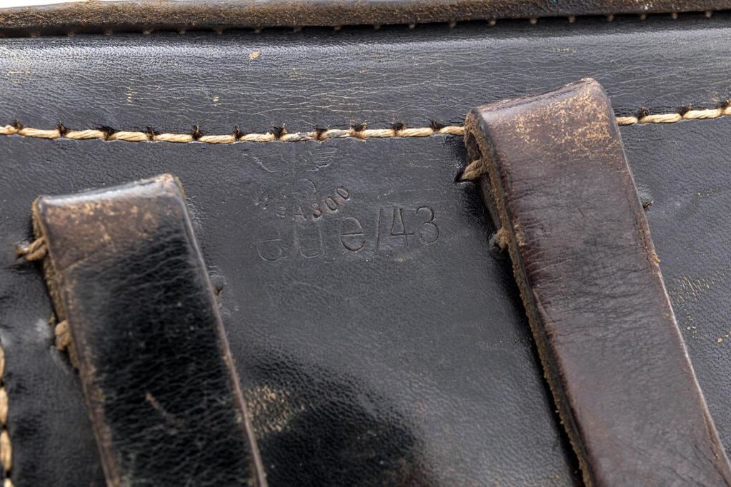WWII German P-38 ac-43 Semi-Automatic Pistol, with Holster, #1956m, 9mm, 5" barrel, blued finish, double action, Nazi eagle firing proof on slide, "(eagle)359" waffenampts on frame and slide, hammer drop safety, drift adjustable replacement blade front sight and fixed rear sight with small "u" slot, all visible numbers matching, lanyard loop, bottom mag release, black plastic grooved grips, two (2) blued steel magazines marked "P.38v", with small "(eagle)359" proof on rear spine. In black hard shell P-38 holster. Condition is good retaining approx. 80% original blued finish, with wear to the bluing on the barrel muzzle and sides, light wear spots on top of barrel at chamber area, sides and top of the slide, front of the frame and trigger guard. Front grip strap is thinning to gray with light freckling; rear frame lug is thinning to gray, wear to the tops of the sights, and tips of the safety and hold open levers. Rear frame lug, lanyard loop, mag release lever, and bottom of the magazine show heavy rust pitting that has been cleaned. Magazine in the gun has the pitted bottom plate, wear and mottling to the finish, and lines from use. Magazine in the holster is very nice, showing just the slightest use and minor wear marks. Action, hold open, and hammer drop safety all function properly; bore is bright and shiny. Grips show light wear, some scuffs, and scratches. Holster is marked on the back "P-38", "eue43", and "(eagle)WaA300". Holster shows wear, scuffs, scratches, and minor cracking and crazing to the leather; the internal pull strap is in good shape. Est.: $1,000-$1,500. (C&R/PPT)