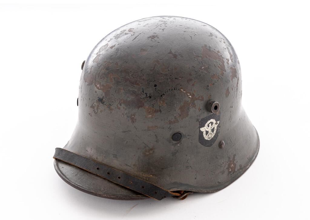 WWI/WWII German Transitional Police Helmet. A WW1 Austrian M17 helmet that has been reworked for the early German/WWII era. Gray/green painted steel body with large vent lugs, riveted chin strap mounts, replaced nine-tongue liner, original black leather chinstrap with faint ink stamp and stamped number markings. Black painted liner rivets. Early style Nazi police eagle and national shield decals on either side. Condition is good, the outside showing numerous dings, scratches, chips, and losses to the paint. Decals show wear and minor losses. Inner and outer surfaces looks like a dark green paint has been removed at some time in the past, with remnants around the liner and on the liner edges and inside under the liner. There are some losses to the paint in the center of the inside, down to bare metal. Liner looks like a later replacement with dark brown leather, no reinforcements around the holes for the string, and an original tie string. Leather is supple and shows minor age and soiling, but still smells of fresh leather. Chinstrap shows age and is a bit dry but basically sound. Est.: $500-$800.