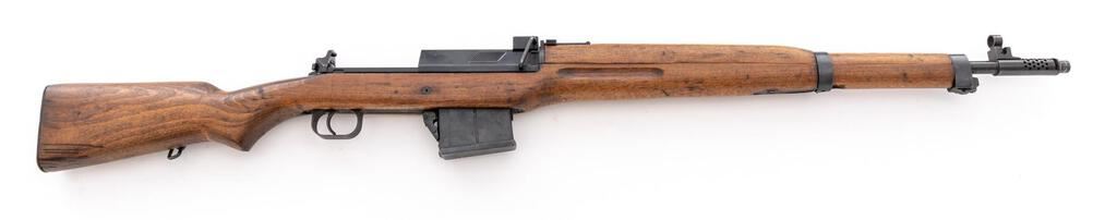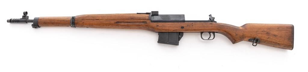 Egyptian Hakim Semi-Automatic Rifle, #38502, 8x57mm, 23.5" barrel, blued finish, hardwood stock set, hooded blade front sight and adjustable leaf rear sight. One very good condition 10-rd. magazine is attached. Marked "HAKIM 7.9mm MADE IN EGYPT" on right-side receiver rail with Arabic script and the symbol for the Maadi Co. on the left side. Condition overall is very good with the metal retaining approx. 90% finish, showing frosting to the receiver cover and cleaning to the buttplate. Stock has a cracked area behind the receiver tang and a chip to the pistol grip, otherwise the wood is very good, with applied finish over old handling marks. Action operates smoothly, bright bore is excellent with sharp well-defined rifling. Import stamped on left side of barrel. Est.: $800-$1,200. (C&R/PPT)