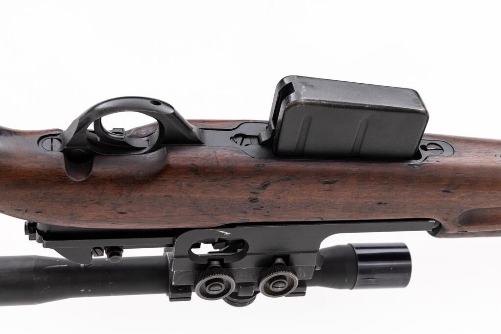 Venezuelan FN-49 Sniper Variant Semi-Automatic Rifle, #1813, 7mm, 24'' barrel, blue/black finish, European walnut stock, with factory scope mount by Echo, and ABL-1951 scope with crosshair post reticle. Venezuelan contract is the only version of this rifle with a factory-fitted muzzlebrake and a thin ribbed buttplate. Condition is fine retaining approx. 95% blue/black finish. Stock with light to just moderate impressions and oil darkening. Matte body of scope with light scuffs and losses. Clear optics, with original sunshade in place. Action is good, bore is fair. (Provenance: Joe Poyer collection.) Est.: $1,800-$2,400. (C&R)
