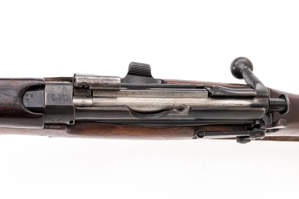 Early British No. 1 Mk 1* Lee-Enfield Bolt Action Rifle, #6238C, .303 Brit. cal., 25.2" barrel, blued finish, walnut stock set, blade front sight with protectors and adjustable tangent rear sight. Marked onright side action body "(Crown)/ER/ENFIELD/1904/SHTLE/I*". Matching number on bolt handle and rear sight leaf. Rifle has the following early features: Early action body without charger bridge and with sliding bolt head, early rear sight and hand guard; early front sight with closed ears. Long-range dial sight and pointer. Early Number 3 magazine with cutoff. An excellent condition British Pattern 14 leather sling is attached. Condition overall is very good, the metal retaining approx. 85% finish, with toning and a dent to the magazine case. Receiver shows pitting to the right side. Wood is very good with sharp "S" markings on the butt tang and forend. Action operates smoothly; bore has darkening in the grooves, otherwise good with good rifling. No visible import marks. Est.: $800-$1,200. (C&R)