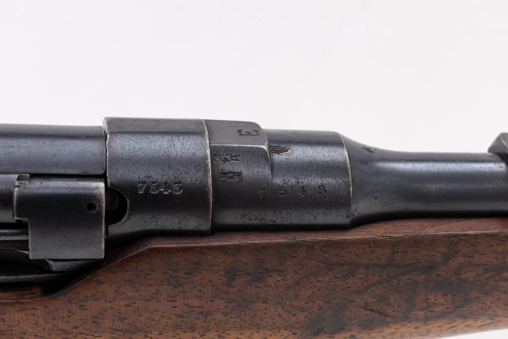Royal Irish Constabulary Lee-Enfield Bolt Action Carbine, #7543, .303 Brit. cal., 20.75" barrel, blued finish, hardwood stock set, inverted "V" front sight and adjustable folding leaf rear sight. Marked on left-side action body with original carbine markings "(Crown)/V.R/ENFIELD//1898/L.E.C/I". Right-side buttstock with over-stamped roundel dated "1901". Brass buttstock disc contains conversion markings "6'/04/R.I.C/4322". Mismatched number on rear of bolt handle. Carbine is fitted with bolt dustcover, early cocking piece, and 6-rd. magazine. Converted from standard carbine by strengthening forend and attaching bayonet mounting bar. Condition overall is very good with the metal retaining over 80% finish, showing patina to left side barrel shank and toning to front band. There are two cracks and an arsenal repair to the tip of the forend with the wood lightly sanded, now good, showing mostly old handling marks to the finish. Action operates smoothly, bright bore is excellent with sharp well-defined rifling. Old Birmingham export proof marks on left side of barrel shank. Est.: $1,000-$1,500. (Antique)