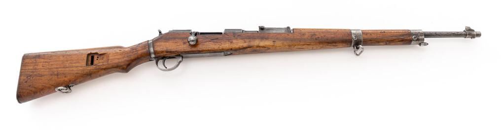 -Hungarian Model 43M Mannlicher Bolt Action Rifle, #A-13973, 8x57mm, 23.6" barrel, blued finish, two-piece hardwood stock, inverted "V" front sight without hood and adjustable tangent rear sight. Marked on top of receiver ring "43M". Barrel shank stamped with St. Stephens crown acceptance stamp. Matching numbers except bolt assembly. Condition overall is very good with the metal retaining less than 60% finish, showing rust and patina on the bands and exposed barrel. Most of the finish appears worn from the stock, otherwise the wood is very good showing impressions, dents and handling marks. Action operates smoothly; bore is dark in the grooves, otherwise good with good rifling. No visible import marks. Est.: $800-$1,100. (C&R/PPT)
