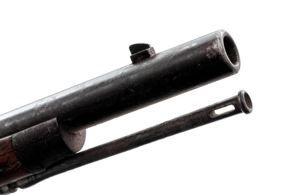 Indian Wars U.S. Springfield Model 1884 Trapdoor Cadet Rifle, #402912, .45-70 Gov't. CF cal., 29.5" round barrel has usual breech markings, block-blade front sight (also bayonet lug) and Buffington long-range rear (marked "R" for Rifle); receiver breechblock is marked "US/Model/1884" at hinge, serial number at tang; flat lock has usual markings; steel trigger guard with swivel, buttplate marked "US", 2 bands (top with stacking swivel), nosecap, slotted button-tip ramrod. Oil-stained walnut fullstock with "SWP" inspector's cartouche at left wrist. Mfg'd ca. 1886-91. Condition is good retaining traces of original blue under scattered oxidation/discoloration, darkened case colors, else moderate roughness, very good edges and markings. Stock is sound with 2 shallow scrapes at right comb, 1" crack at rear lock screw, else smooth with faint cartouche. Action is crisp, frosted bore has moderate erosion toward muzzle, good rifling. Est.: $600-$800. (Antique)